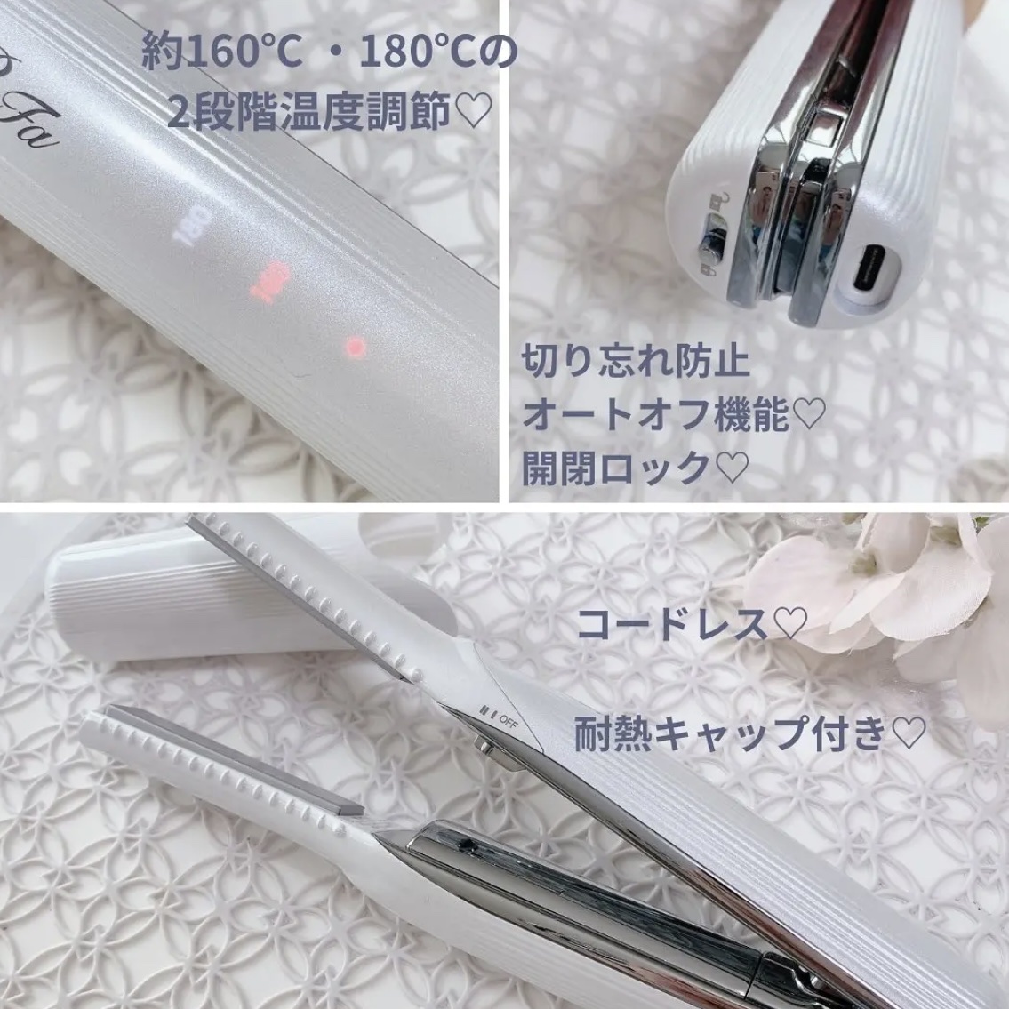 ・充電式で持ち運びできる‼️ ・細いから、髪が短い人や、前髪、顔周りのスタイリングに向いている✨️✨️✨️ ・最高温度が180度までなので、髪にちょうど良い︎👍🏻 ̖́- ・大きめのアイロンでするよりも、綺麗に仕上がる😍 ・先に蓋付きで持ち運びや、コンパクトに収納出来る‼️ ・デザインがシンプルなのに可愛すぎる🤦♀️💕 ・今までのアイロンが使えなくなるくらい良い🙆♀️