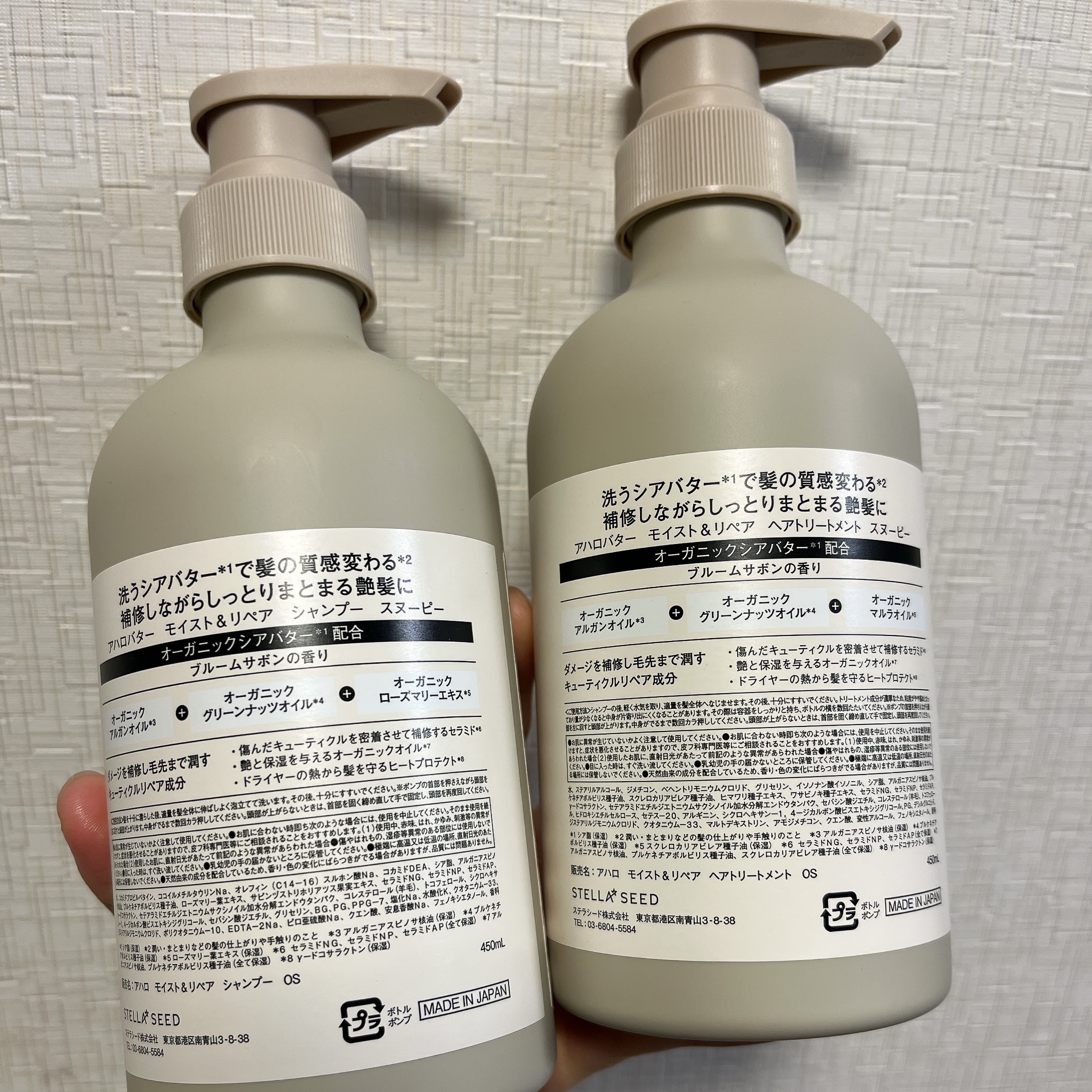 くせ毛、軟毛によるAHALOBUTTERモイスト&リペアシャンプー/ヘアトリートメントをがちレビューしていきます。【使った商品】AHALOBUTTERモイスト&リペアシャンプー/ヘアトリートメントスヌーピーデザイン限定キット【商品の特徴】厳選されたオーガニック成分シアバターのもつ保湿力で、キューティクルを立体補修ドライヤーの熱から髪を守る【使用感】シャンプーして流しても軋まないヘアオイルつけてなくてもさらさら【良いところ】シャンプーして流しても軋まない髪の毛の絡まりが減った寝癖が治しやすくなった枝毛が減った【イマイチなところ】スヌーピーデザイン限定キットは入れ物が不透明だから減りが分かりづらい【どんな人におすすめ?】シャンプーして流した時に軋みを感じる人枝毛が気になる人✂ーーーーーーーーーーーーーーーーーーーー私が購入した時はスヌーピーとコラボしていて、かわいくてついつい買っちゃったものが結構当たりでした!!オーガニック成分がたくさん入っていて、毛先までめっちゃまとまります。外部活の私でもめっちゃ良かったです!少しでも参考になれば嬉しいです!!良い1日を!!