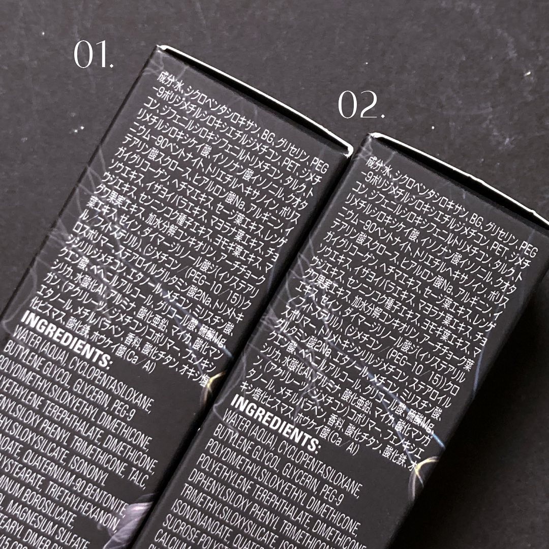 - 水、アクリレーツコポリマーアンモニウム、BG、1,2-ヘキサンジオール、ベヘネス-30、フェノキシエタノール、ヒドロキシアセトフェノン、カプリリルグリコール、AMP、ポリグリセリル-3ジシロキサンジメチコン、クエン酸、PG、ベントナイト、キサンタンガム、センチフォリアバラ花エキス、ラベンダー花エキス、ローヤルゼリーエキス、セスキイソステアリン酸ソルビタン、ヒアルロン酸Na、カミツレ花エキス、トコフェロール、アボカドエキス、ミリスチン酸ポリグリセリル-10、ステアリン酸ポリグリセリル-10、ジイソステアリン酸ポリグリセリル-2、トリイソステアリン酸ポリグリセリル-3[+/-]、赤226、コンジョウ、酸化鉄、カーボンブラック