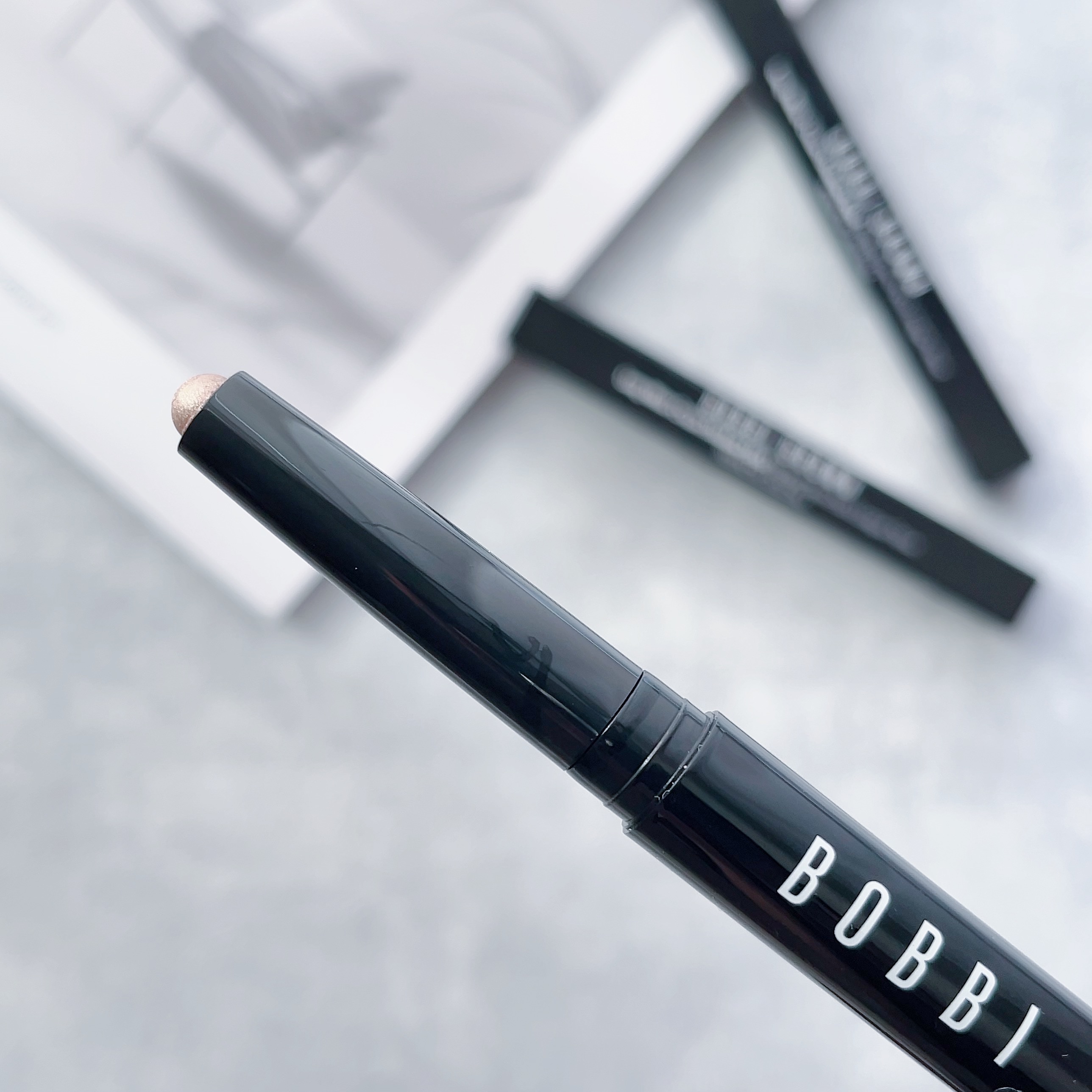 スティックなのでそのまままぶたに塗って指でぼかすと一瞬でアイメイクが完成します。 忙しい時でも手軽にボビイの煌めきが楽しめるのが良いですね🥰 塗ってるときはクリーミーなのですが、その後ぴたっとまぶたに密着してくれるのでクリームタイプのアイシャドウにしてはヨレづらいと思います。 個人的には今回のコレクションのパール感・ラメ感を楽しむためにマットのお色と合わせるのがおすすめです。