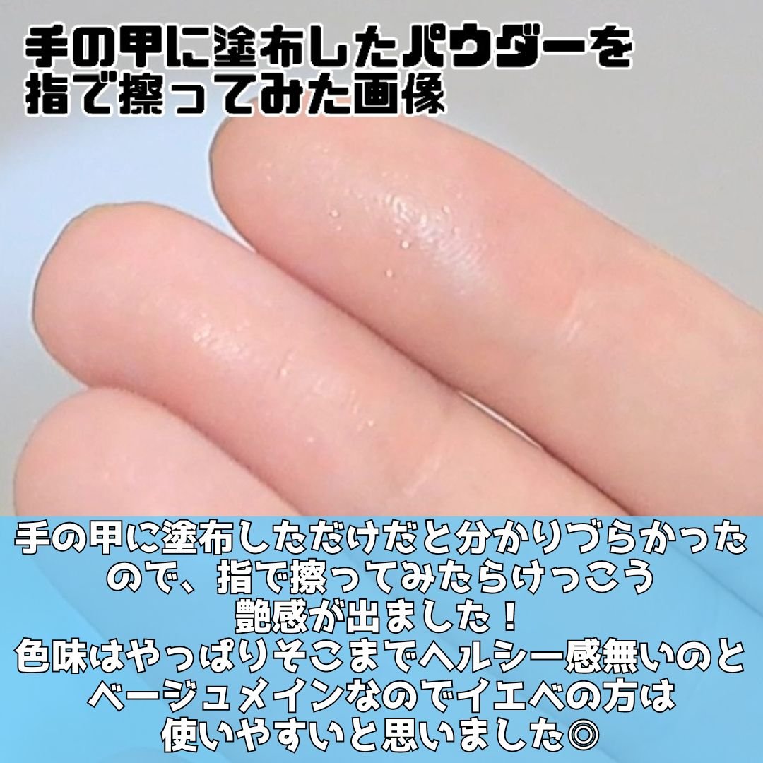 ヘルシーグロウという名前なのと見た目的にけっこうヘルシー肌トーンになるのかな?と思いながら使ってみましたが、だいぶ肌に馴染む色味!(私の肌トーンは黄み肌のまあまあ明るめ) 恐らくマーブル模様に入っているラベンダーピンク系の色が上手いことトーンを調整してくれている感あります👍 又、ラメ(パールに近い)も入っているのが可愛い!動画だとわかりづらいのですが、肉眼で見るともうちょっとキラキラしていて存在感はあるけどうるさいかんじじゃないのが◎