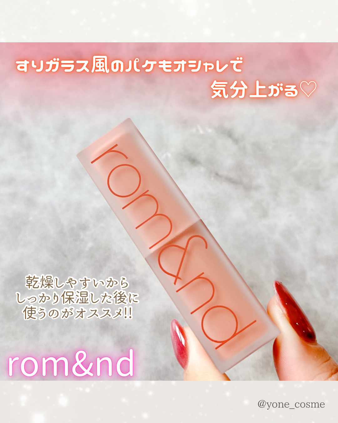 質感可愛すぎる!!/rom&ndのふんわりマットリップ♥️rom&ndゼロマットリップスティック¥1320何も塗ってないかのような軽いタッチ感♡塗ったとたんピッタリ密着!!ふんわり軽くてスルスル塗れる️🫧すりガラス風のパケもオシャレ✨️リップには&の刻印が💕【23RUDDYNUDE】深すぎず使いやすいヌーディーレッド♥️簡単に華やかなリップに✨️イエベ春・イエベ秋さんにオススメ!!.˚⊹⁺‧┈┈┈┈┈┈┈┈┈┈┈┈┈┈┈┈┈‧⁺⊹˚.ここ数年ツヤリップばかり使っていてマットリップは久しぶりでした!!マットリップはどうしても難しいイメージがあり避けていましたがこのリップはスルスル塗りやすくてふわっとした質感がとっても可愛い💕マットリップなのでツヤリップよりはもちろん乾燥しやすいですがパサパサ感は無く使いやすかったです🥰しっかり保湿した後に使うとキレイに仕上がります!!唇が荒れている時はキレイに色がのらないので、しっかりケアして整っている時に使いたいと思います💕全23色もあってふわふわ質感とパケが可愛くて集めたくなってしまうリップでした😆✨️#PR#rom&nd#ロムアンド#ゼロマットリップスティック#マットリップ#リップ#プチプラコスメ#韓国コスメ#イエベ春#イエベ秋#Qoo10#春映えチーク&リップ