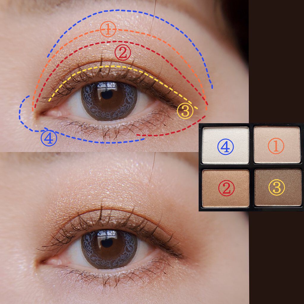 左下のポイントカラーはテラコッタのようなブラウンで、全体的に明るめな印象。 デイリーに使えるリッチ&パールで自然な陰影のある目元に。 使う色、量によって可愛くも大人っぽくもなれると思います。