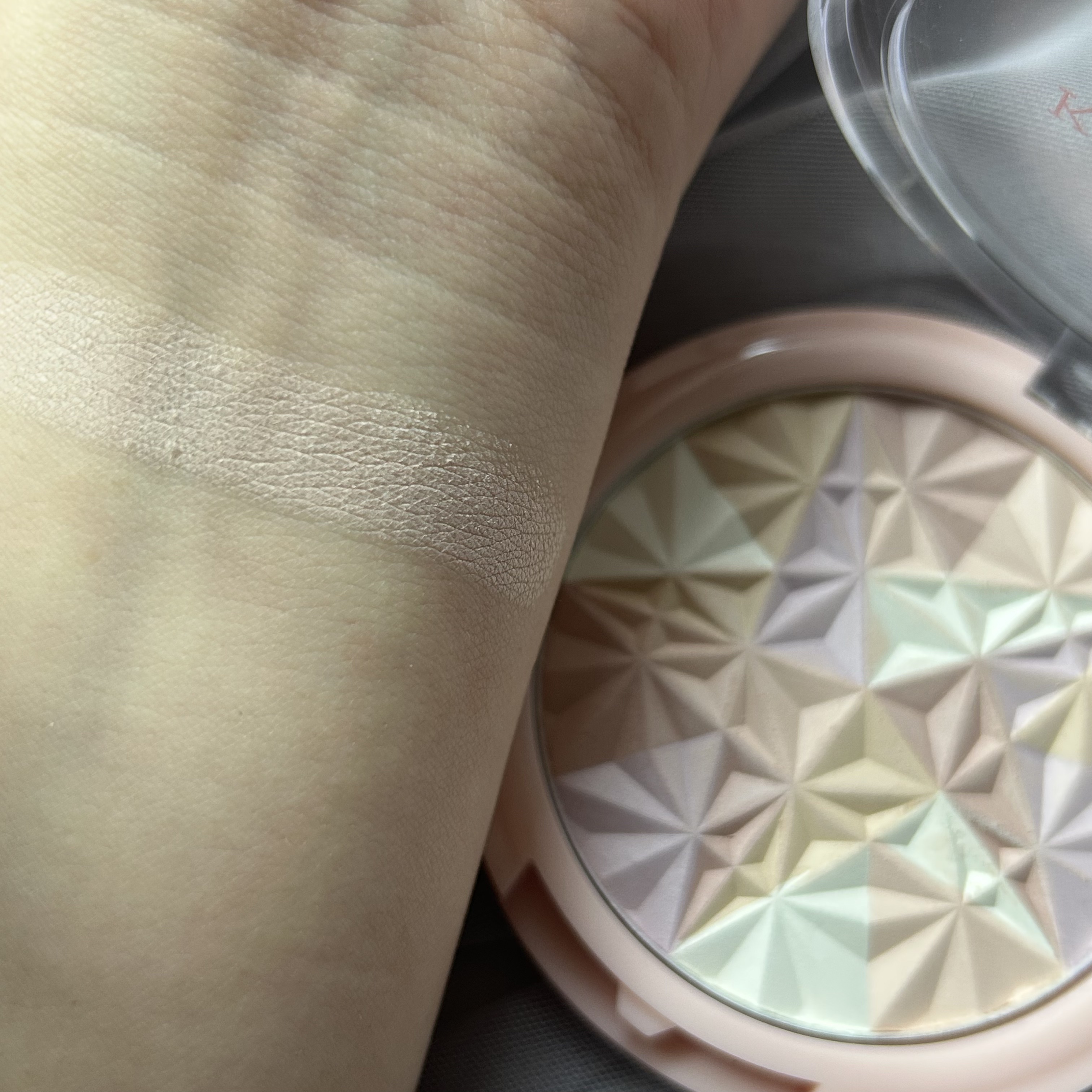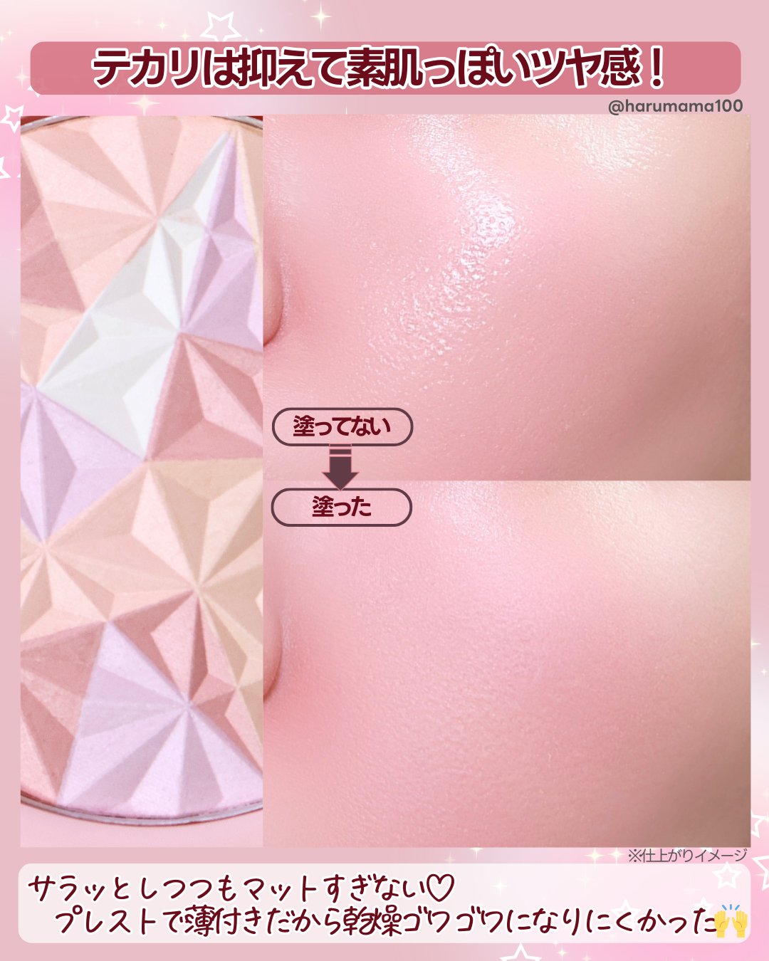 割と薄付きで、ガッツリのせてもあまり白っぽくなく粉っぽさもないので使いやすいです🫶🏻 ラメ感もありますが派手にならずナチュラルな仕上がりになりました🥺 保湿成分配合でツヤ感のある肌になります💗