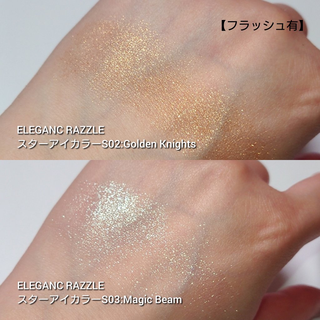 エレガンス ラズル キラキラ、ときめきをくれる大好きなコスメ。 きらきらかわいい新色2つ。 発色の良さ、きらめきにびっくり! Pink Stripは、流行のフューシャピンク。 ひと塗りで圧倒時な発色とシルバーラメ。 Magic Dustはパッと目を引くパープル。 シルバーラメがぎっしりなんだけど、Pink Stripと比べるとなんとなくマットな質感。 ラメたっぷりなアイカラー。 ギラギラって感じじゃなくて、上品さを保ちつつめいっぱいにラメをいれたって感じ! Glistening PassionとGolden Knightsは両方ともオレンジなんだけど、赤み強めがGlistening Passion、黄み強めがGolden Knightsかな。 肌馴染みの良いカラーで、単体使いも合わせ使いも可愛いよ。