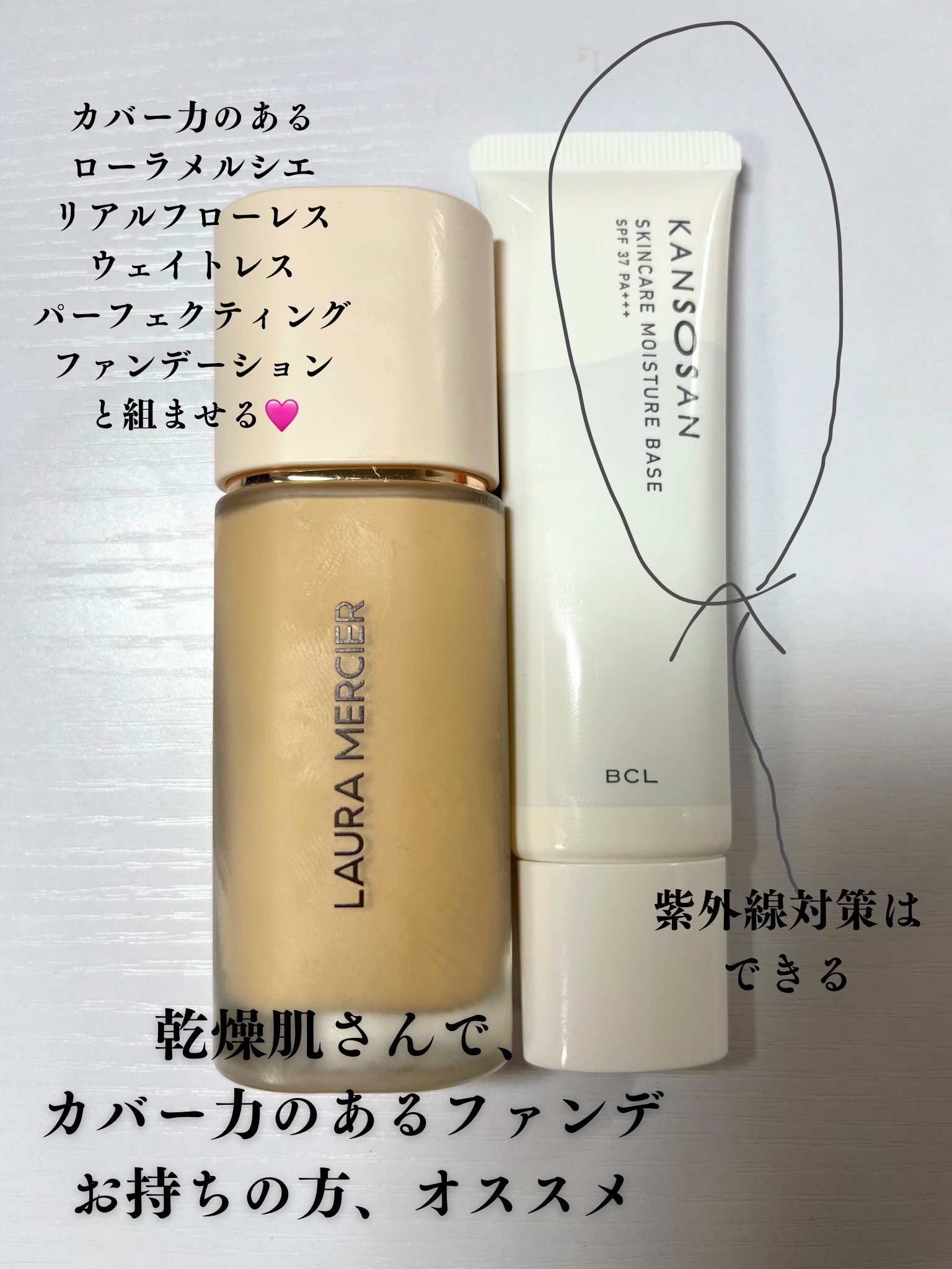 スキンケアの延長ですねこれは、というしっとり感。なのに紫外線対策もできる。 日中も乾かない。 だけどカバー力ゼロ!! すごいよね。保湿に全振りした下地。 なので私はカバー力に絶大な信頼を寄せる ローラ メルシエリアル フローレス ウェイトレス パーフェクティング ファンデーション1W1を組ませて使用。 このファンデ、 ワントーン明るいのも買ってみよ🥰❤️