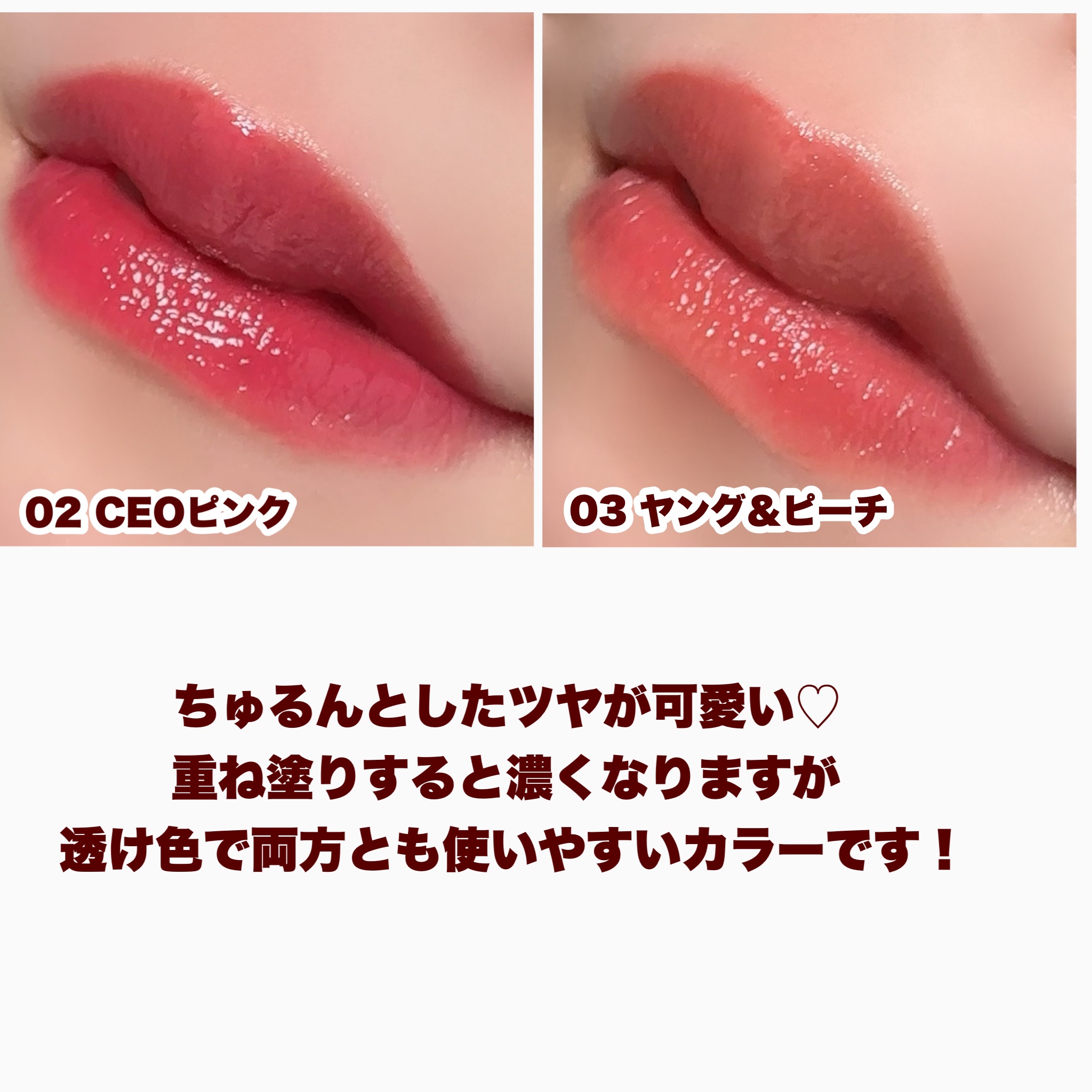 ちゅるんとしたツヤが可愛い♡ 重ね塗りすると濃くなりますが透け色で両方とも使いやすいカラーです! ツヤごと落ちにくいと聞いて即購入したのですが、ティッシュオフしても本当にツヤが残る! この赤いパッケージめちゃくちゃ好き♡