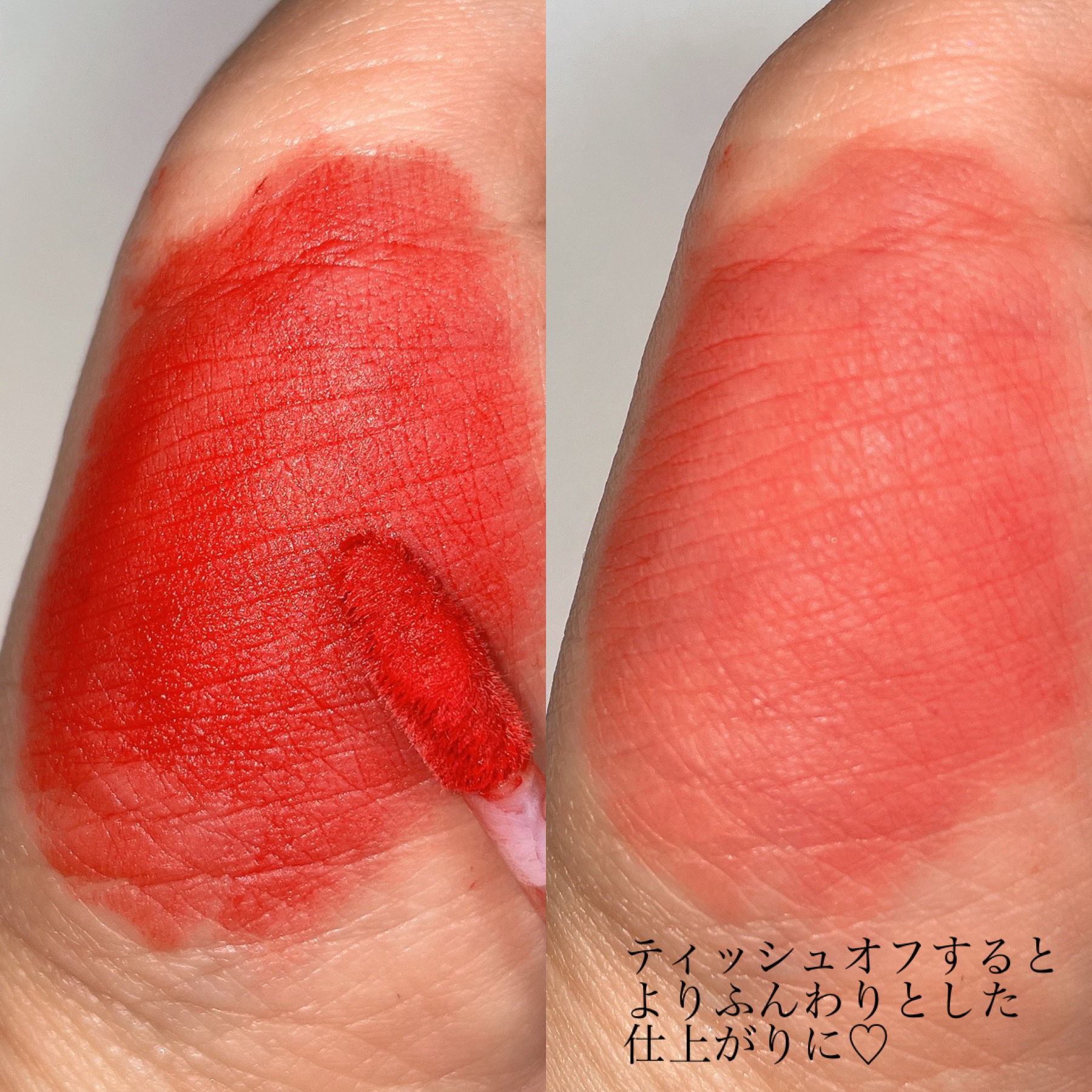 アイテム名にフェアリーとつくだけあって軽い着け心地が特徴的!ムースのようにふわっとしたベルベットティントです かなりの高発色でちょん、と付けるだけでしっかり染まります♥️ティッシュオフはした方が良いです! 101は明るめのレッド春夏向けかな?元気さと可愛さが溢れたカラー🍎 ベルベットティントなだけあって仕上がりはマット寄りでした 持続も良くて塗り直しの時間ないし落としたくない!って日のベースにもおすすめ🙆♀️