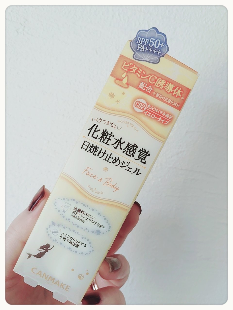 【ビフォーアフター画像あり】肌の色ムラ+シミをさりげなくカバーするイエロー下地の日焼け止めジェルキャンメイクマーメイドスキンジェルUVC02サニーイエロー770円(税込)日本製SPF50+PA+++石鹸オフ無香料美容液成分83%配合ビタミンC...
