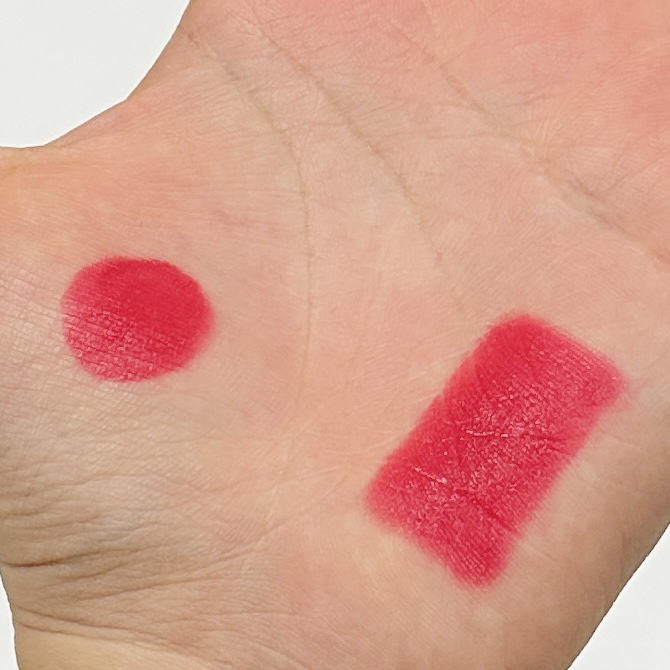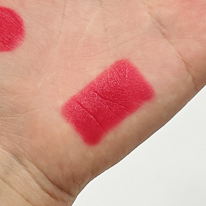 ピンクと赤の中間色で、そこに青みを一滴混ぜた感じのカラー🩷めちゃくちゃ鮮やかで、パキッとしたカラーです🌈 乾燥しにくいスフレマットで色持ちも抜群◎ 縦じわも目立ちにくいマットリップです🥰 特にブルベさんにおすすめしたい!