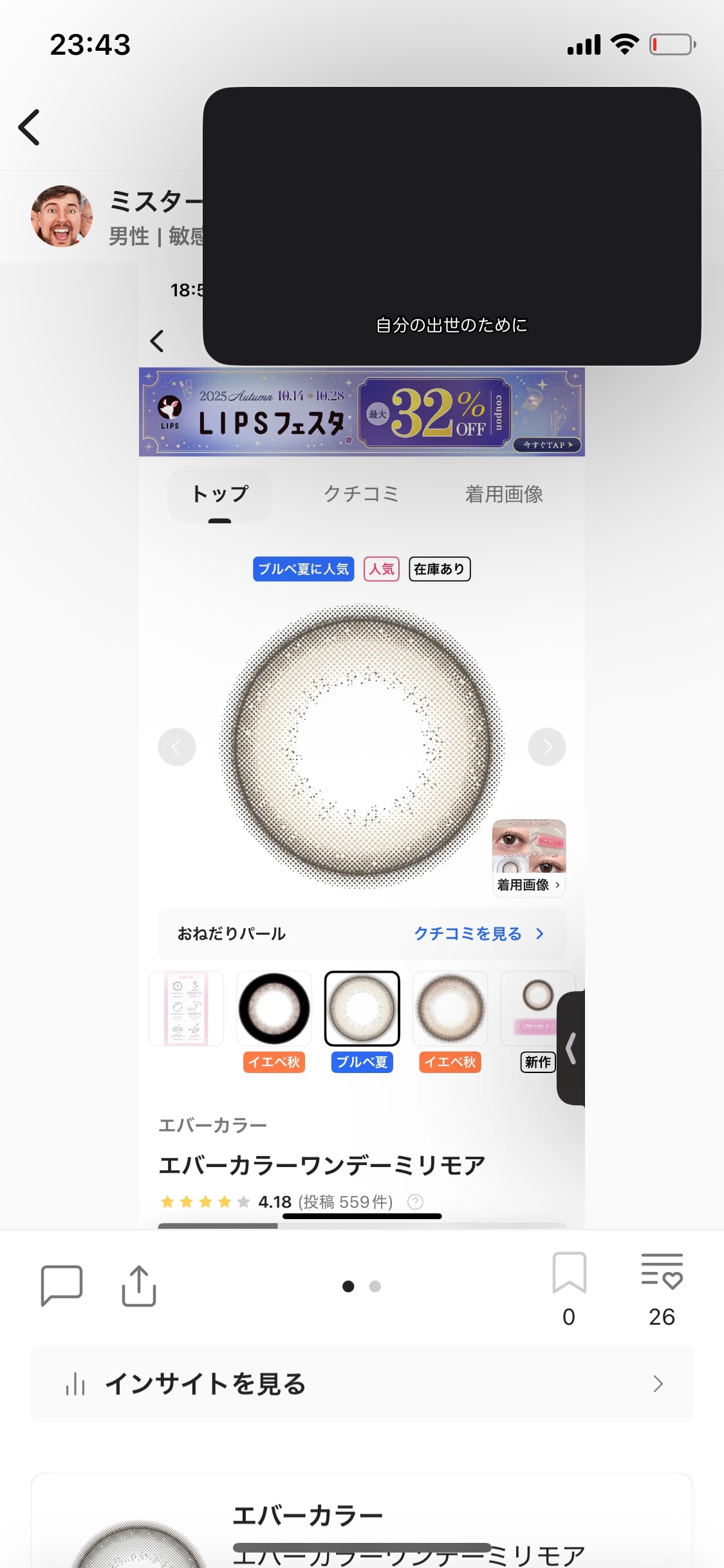 説明文にはベージュって書いてあるんだけど、 真っ黒目に乗せるとオリーブっぽい ダークグレーに発色して色全く変わらない!😂 発色が暗すぎてフチもほぼ見えないし、 トーンアップ効果はほとんどないから ただ黒目がサイズアップしただけだった😭 この素材にしては酸素透過率高めだけど かなりの高含水だから目薬必須です🥲 正直デザインや付け心地ともに 全くリピしたいとは思えないカラコンでした😂