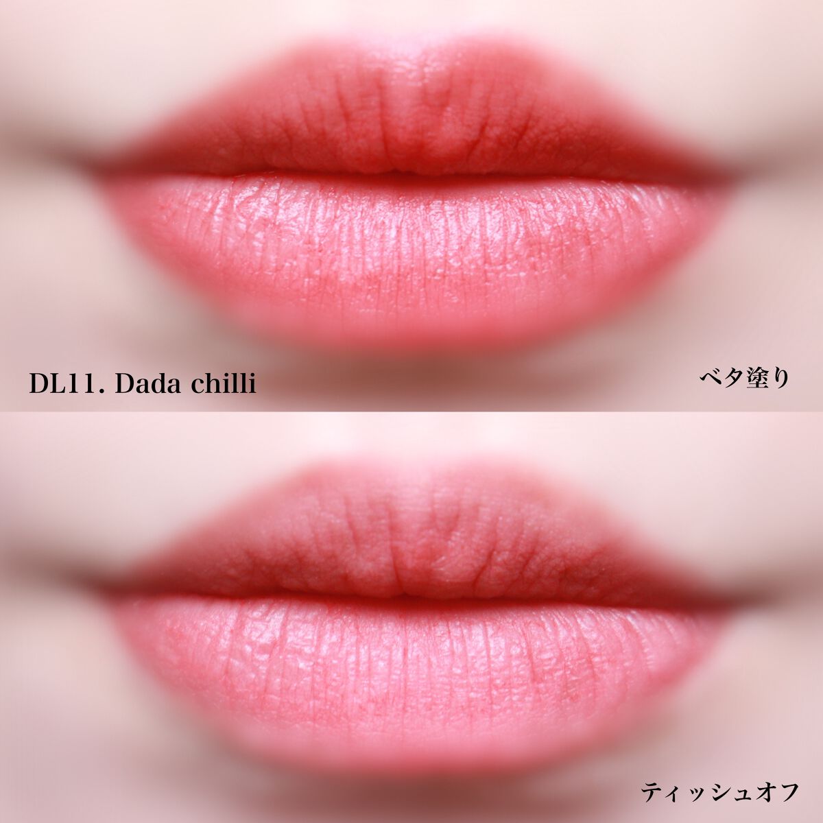 唇に触れるとすぐに鮮やかなカラーリングとフィルム膜で保湿と栄養のダブルレイヤリング。 ころんと可愛いシルエットのベルベットティント❤️🔥 DL11.Dada chilli 誰でも使いやすいジューシーなレッドで薄く伸ばすと濃すぎずふんわり可愛いカラーに。 DL13.Gothic jujube 深みのあるブラウンレッドでお洒落な雰囲気のある仕上がりに。 サラッとした軽いテクスチャーで伸ばすとふんわりしあ柔らかい質感に🥰 縦じわが気にならない綺麗な仕上がりが嬉しい! ティッシュオフ後の血色感のある仕上がりも可愛くてお気に入り❤️