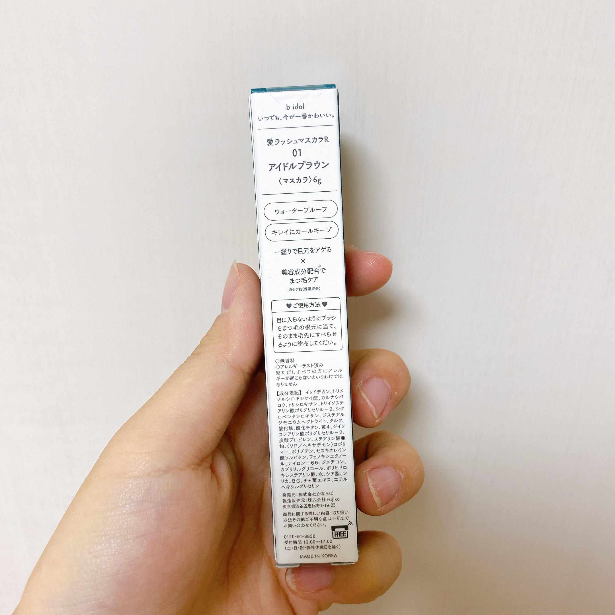 このマスカラには美容成分が配合されているのでまつ毛ケアもでき、 ウォータープルーフに、 しっかりカールキープもしてくれます💕 そしてこのブラウンマスカラの1番の良さはこのライトブラウンの色です! まつ毛に塗ると黒のように目立って派手になりすぎず、垢抜けた繊細な目元に仕上げてくれます😍 b idolのマスカラはとても落ちづらいです 泣いたりしても取れづらいので泣いたりしがちなライブ参戦オタクには嬉しい仕様❤️