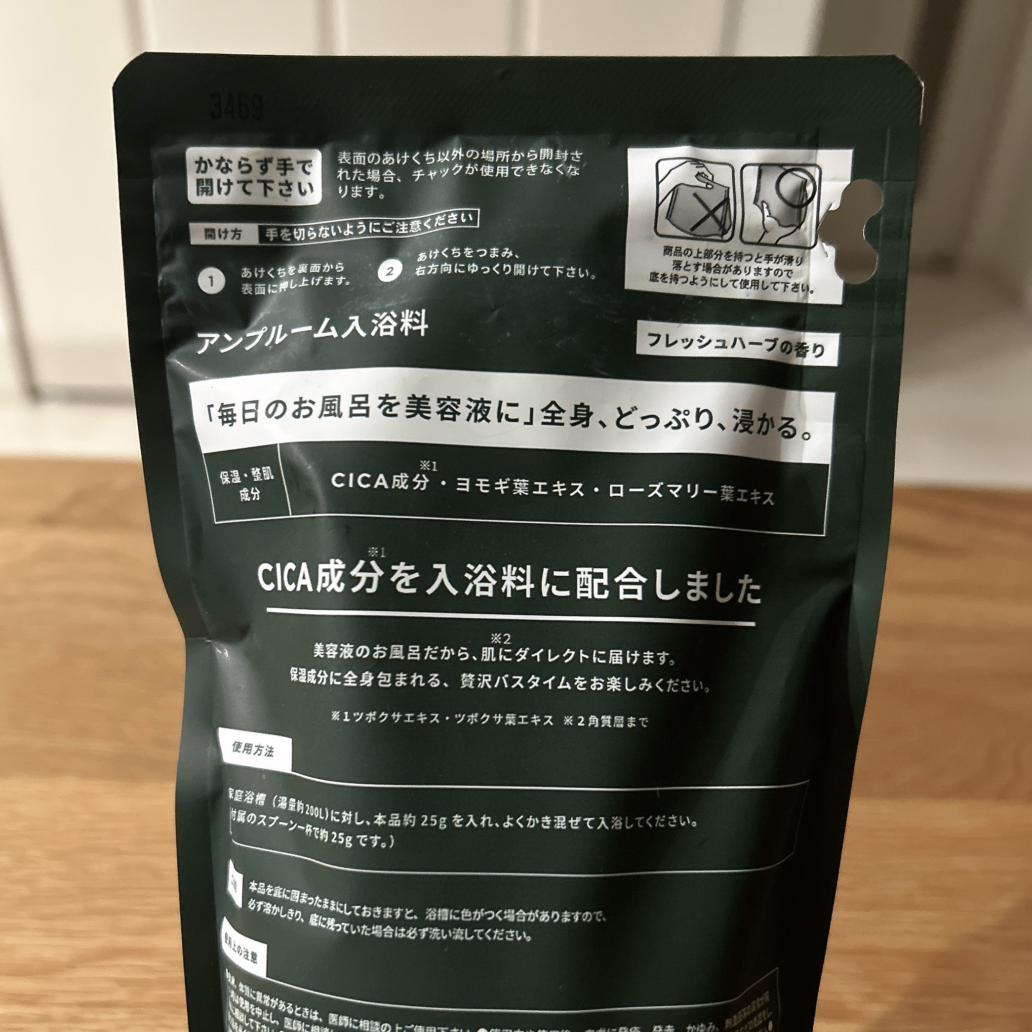 amproomの入浴剤 cicaの入浴剤と言われたらお肌にも良さそうですよね ツボクサエキスとツボクサ葉エキスが配合されていて肌荒れを防ぎ ローズマリー葉エキスとヨモギ葉エキスがお肌にうるおいを与え 全身キメの整った肌にしてくれます 背中までしっかり行き届き夏へ向けた背中ケアにも 袋は手で開けやすくて便利で中にはお風呂に入れる時用のスプーンまでちゃんと入っていました