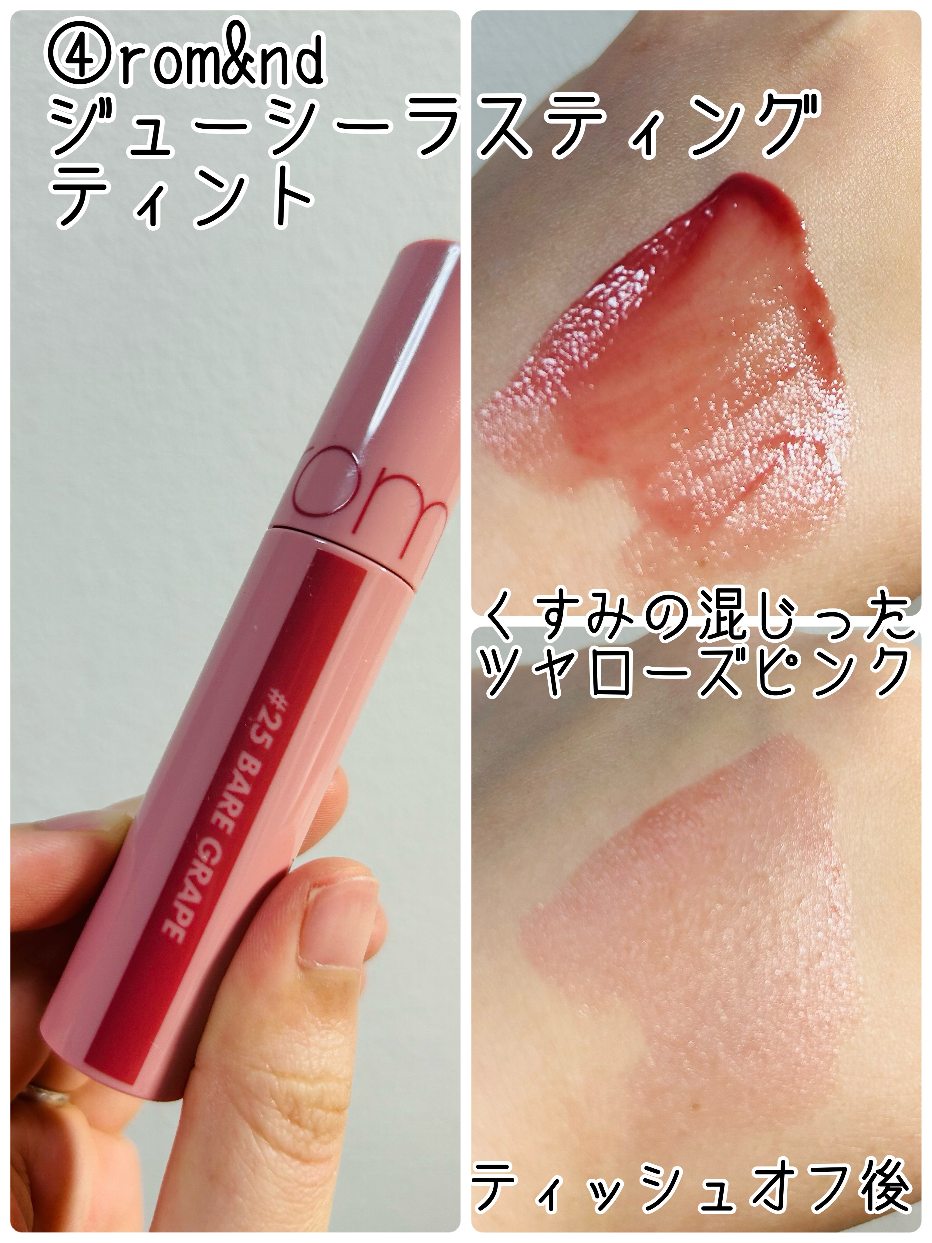 メガ割を機に!やってみたかった、Qoo10で買った手持ちリップのレビューまとめを作りました!💄✨乾燥肌(リップも乾燥しがち)&どブルベの嗜好が入ってますが、どなたかのお買い物の参考になれば嬉しいです♡〜ナチュラル編〜ニュートラルな色味、ナチュラルメイクに使いたいアイテムを4つ選びました✨✼••┈┈••✼••┈┈••✼••┈┈••✼••┈┈••✼①shaishaishaiSUN-KISSEDPlumpLipBalm【特徴】透けたチェリーのような色味が可愛いです🍒プランプ効果のあるバームなので唇をふっくら、ぷるっとさせてくれるアイテムです!保湿力高めで、長時間バームの潤いがキープされます!でもバームなので、色持ちはしません😭【良いところ】・リッププランパーには珍しく、バームタイプで色味もしっかりつく!メイクしたいけど唇が荒れている時、血色が欲しい時におすすめです!・無香料【イマイチなところ】・カラバリがない。・リップバームなので色持ちは良くない。────────────②INTOUコンデンスフォグリップマット【色味】C02じゅわっとライチ【特徴】個人的には③のHOLIKAHOLIKAフォギーブラーティントによく似てると思います。こちらの方がさらっとしたマットになり、そのテクスチャーのおかげか、崩れ方が綺麗です✨C02は誰でも使いやすいナチュラルピンクで、赤ちゃんのような血色のイメージです👶私は家にいる時に使うことが多いのですが、家族がよく褒めてくれるので、健康的に見えるのかな?と思ってます👍【良いところ】 ・マットに見えるのに乾燥しにくく、パサついた汚い落ち方になりにくい!・カラバリ豊富だが、ナチュラルなトーンが多いので失敗しにくい✨【イマイチなところ】・飲食すると落ち方の綺麗さに影響があります。 お出かけの時はお直し必要です!────────────③HOLIKAHOLIKAフォギーブラーティント【色味】#03Cooing【特徴】ふわっとした、名前の通りの霧のような柔らかい印象をつくれるリップです。テクスチャーもふわっとした柔らかさがあり、保湿をしっかりして、ムラなく綺麗につけられれば、結構色持ちます。つけたては若干重たさがあるので、うまく馴染ませられないと色持ちはイマイチかも…🧐【良いところ】・乾燥を感じにくいマットで、カラバリが豊富! ブルベのマットカラーはも沢山あるので、ブルベさんにぜひおすすめしたいです✨✨ 【イマイチなところ】・丁寧につけないと落ち方が残念になるので、 少し気を遣わないといけないと思います💦────────────④rom&ndジューシーラスティングティント【色味】25ベアグレープBAREGRAPE【特徴】言わずもがな、有名なジューシーラスティングティントの「ベア」シリーズです。25のペアグレープはくすみの入ったピンクでオフィスでも使いやすいカラー✨✨艶も保湿力もあるので、どんなシーンでも好印象のリップを作れます!【良いところ】・大人でも使いやすい、くすみローズピンク!・ツヤと色持ちが最高!【イマイチなところ】・くすみが苦手な人にとっては、注意が必要なカラーです。ちなみに青みかんは、ブルベの青みが得意。くすみは得意じゃないけど少しなら平気、というレベルですが、お直しなので重ね塗りすると若干くすみが強くなってしまい、ちょっと老けて見えました😭1〜2度塗りがちょうど良かったです✨✼••┈┈••✼••┈┈••✼••┈┈••✼••┈┈••✼#Qoo10メガ割