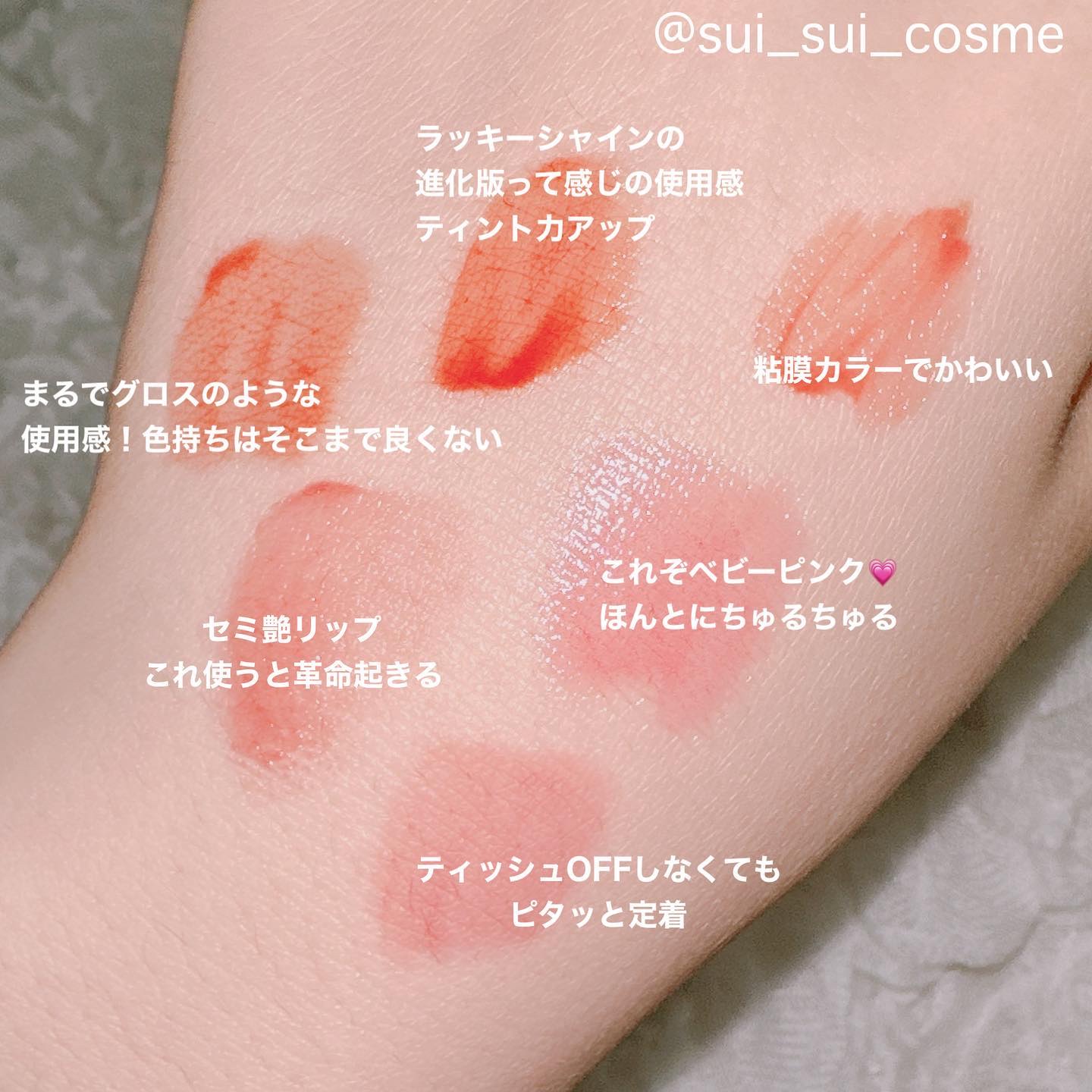 ・ゆるめのムースのような液 ・仕上がりは、透け感あり/セミ艶〜セミマット ・擦れには強く、そのままの色味がしっかり残る。 ・色は、公式写真よりやや黄み寄り ・03、04はくすみがありツヤツヤし過ぎないのでPCサマー/オータムに適していると思われる 【総評】好印象。荒れなければ他のカラーも購入する