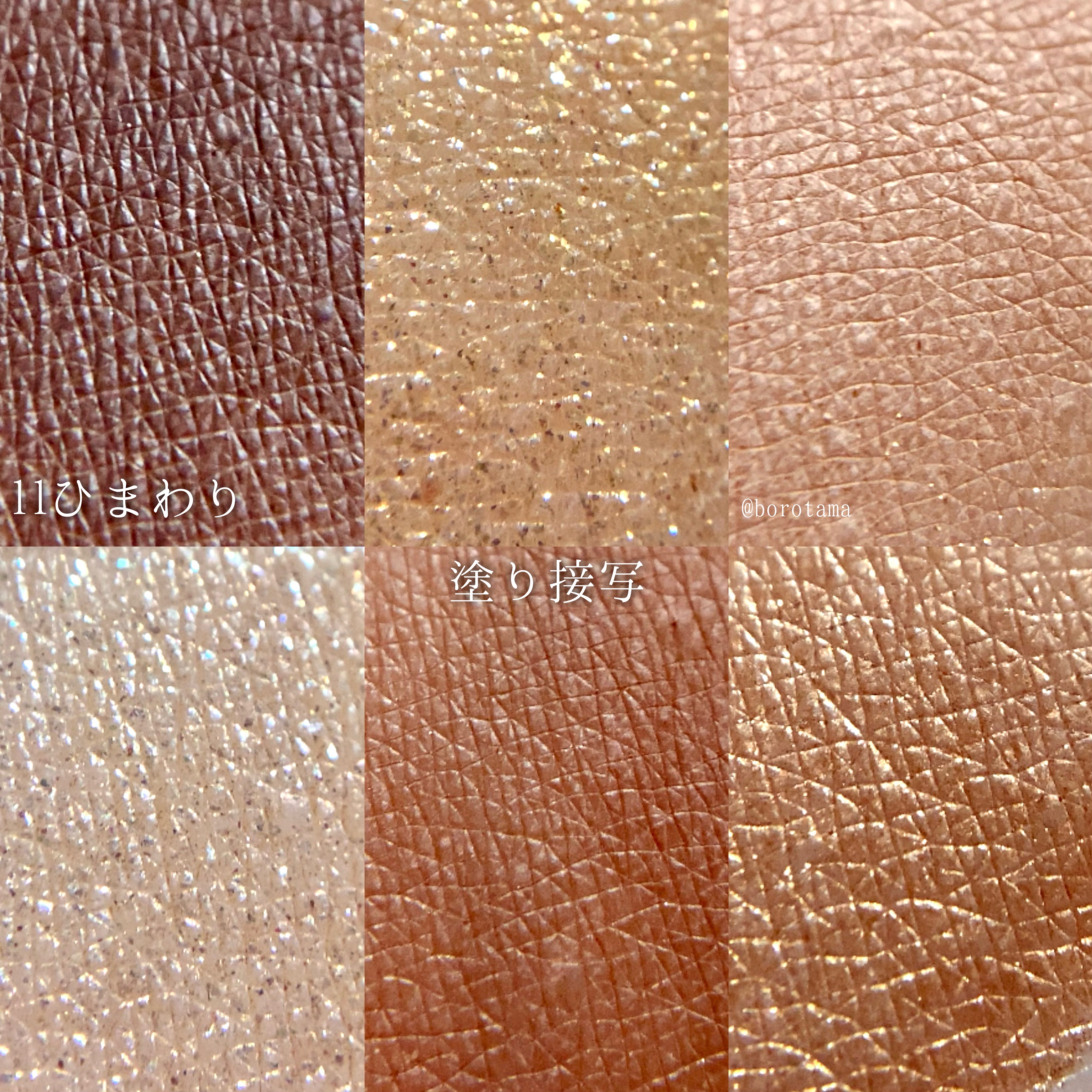 本物のキャンバスのようにエンボス加工されたこだわりのパケに絵画から着想を得たマーブル模様が美麗すぎる〜🥹 しかもかわいいだけじゃなくて粉質もいい🫶🏻 柔らかいしラメ飛びしにくいし発色良いし言うことね〜。まるで顔が可愛くて性格もいい人みたいだね…良いところしかないやん。羨望。 マーブルの所のラメがねぇ多色でねぇ 透明感たっぷりなブルー系のラメが涙袋とかに入るとめちゃかわいいんですよね、よろし〜!! ひまわりの所もあってね🌻 ここは王道のゴールドラメでね、ファビュラスでセレブレイトでハイソな感じが美しいです。 ブラウンに重ねやすい配色でイエベさんにぴったり!これはめちゃくちゃおすすめ
