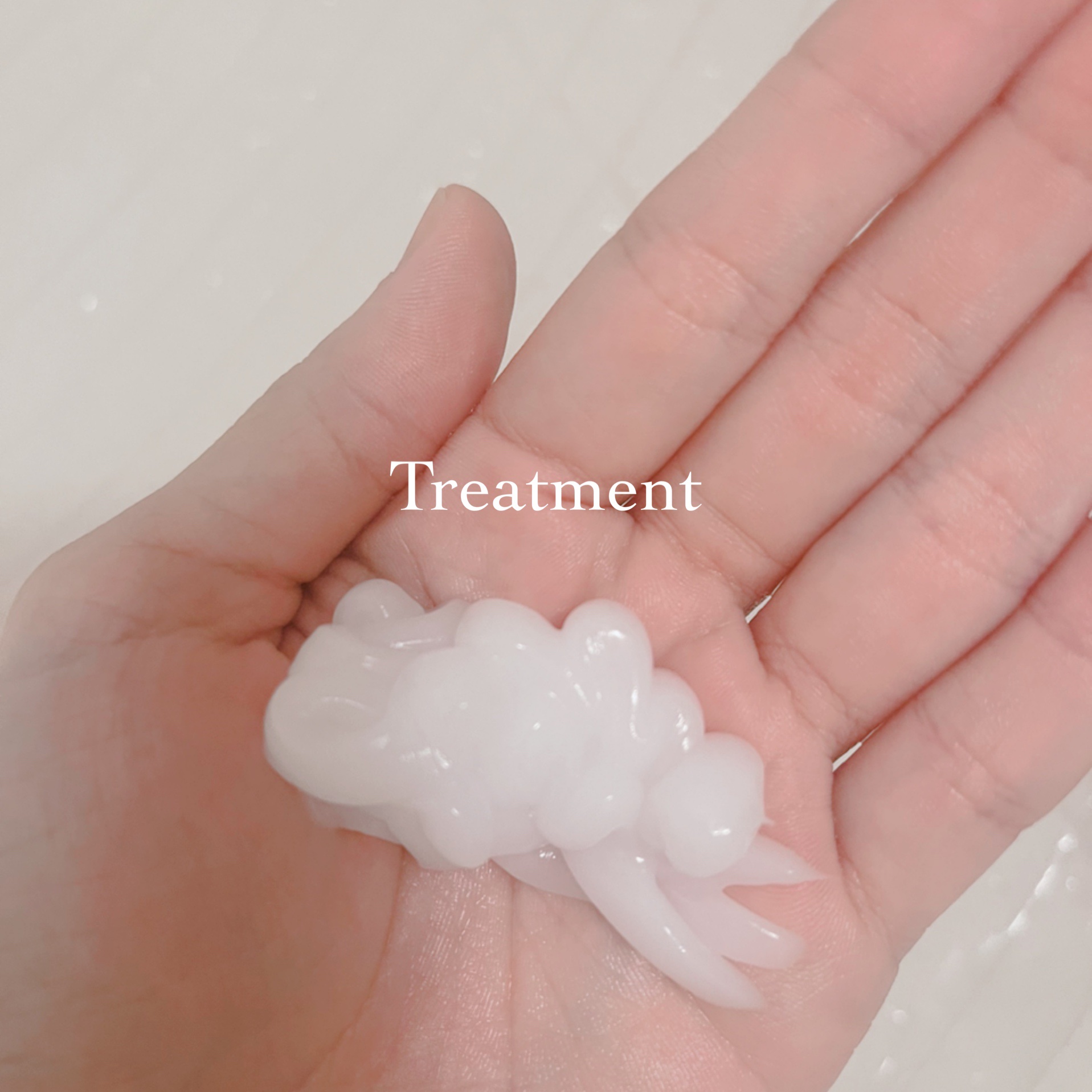 軋みや指通りの悪さはありません。 ふわふわの泡立ちで、しっとりします。 アミノ酸系は洗浄力は控えめ、泡立ちは弱めですが、頭皮に優しい。 髪の美容液PPTを過去最高 高配合していて洗い上がりもしっとりし乾燥・ハイダメージの方にもぴったりな使用感だなあと感じました。 心ときめくホワイトムスクがほんのりやさしく香りしつこさがないのでにおいに敏感な方もOK🙆♀️ トリートメントは、しっかりとしたポテっとしたテクスチャーだけどするっーと髪に馴染んで優しく潤いで包み込んでくれる感じ。 使った後は、まとまり良く、朝のスタイリングが楽チンになりました。 髪の艶も増し、うねり毛も気にならず、お気に入りになりました。