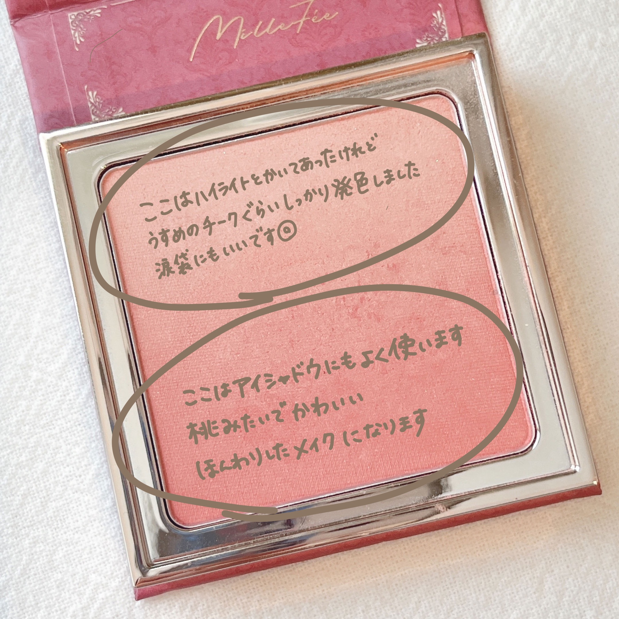 天使のほっぺのように柔らかく儚げな表情を演出するグラデチーク 繊細なパールが自然なツヤ感を引き出すとふんわり感の演出できるMilleFéeの優秀チーク❤️ なんといってもこの見た目が可愛いすぎる、 絵画がそのままコスメになりました、みたいなチーク、 ふんわりとした粉質で肌への密着力も高く、毛穴落ちする感じもなく、 ナチュラルに血色感がプラスされるような使用感が好き☺️❤️ 見た目だけじゃなく、中身がめちゃくちゃ優秀で使用感が良いし、 使ってると可愛くてテンションあがるし、とにかくおすすめ。
