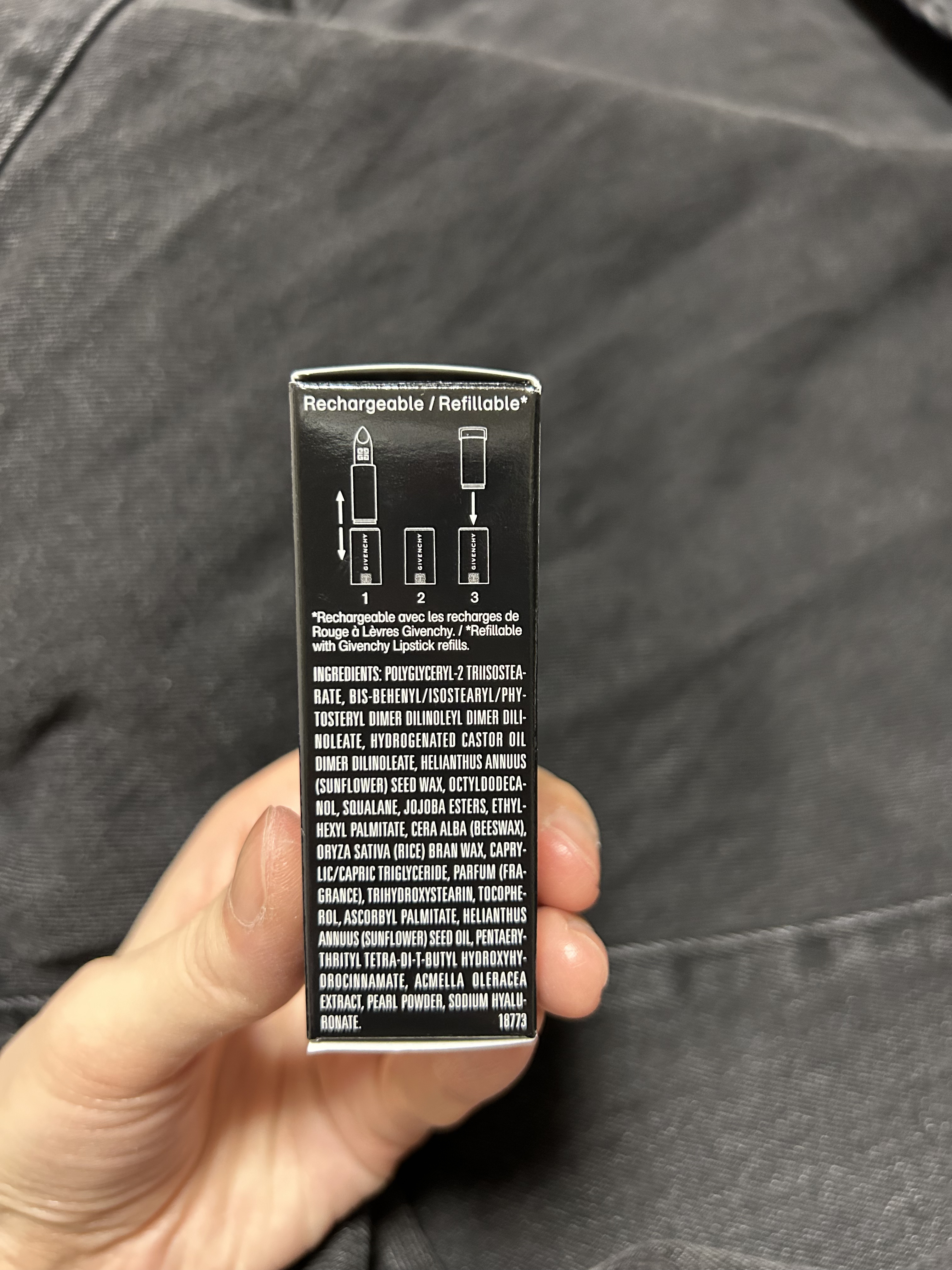 着け心地は油っぽくなく、香りがよいので上から他の何か色付きものをつけるのはもったいない気持ちになります 入れ物も重厚な… シンプルだけど豪華なデザインです 側面にこれでもかとGIVENCHYのロゴが刻まれていて何とも豪華です