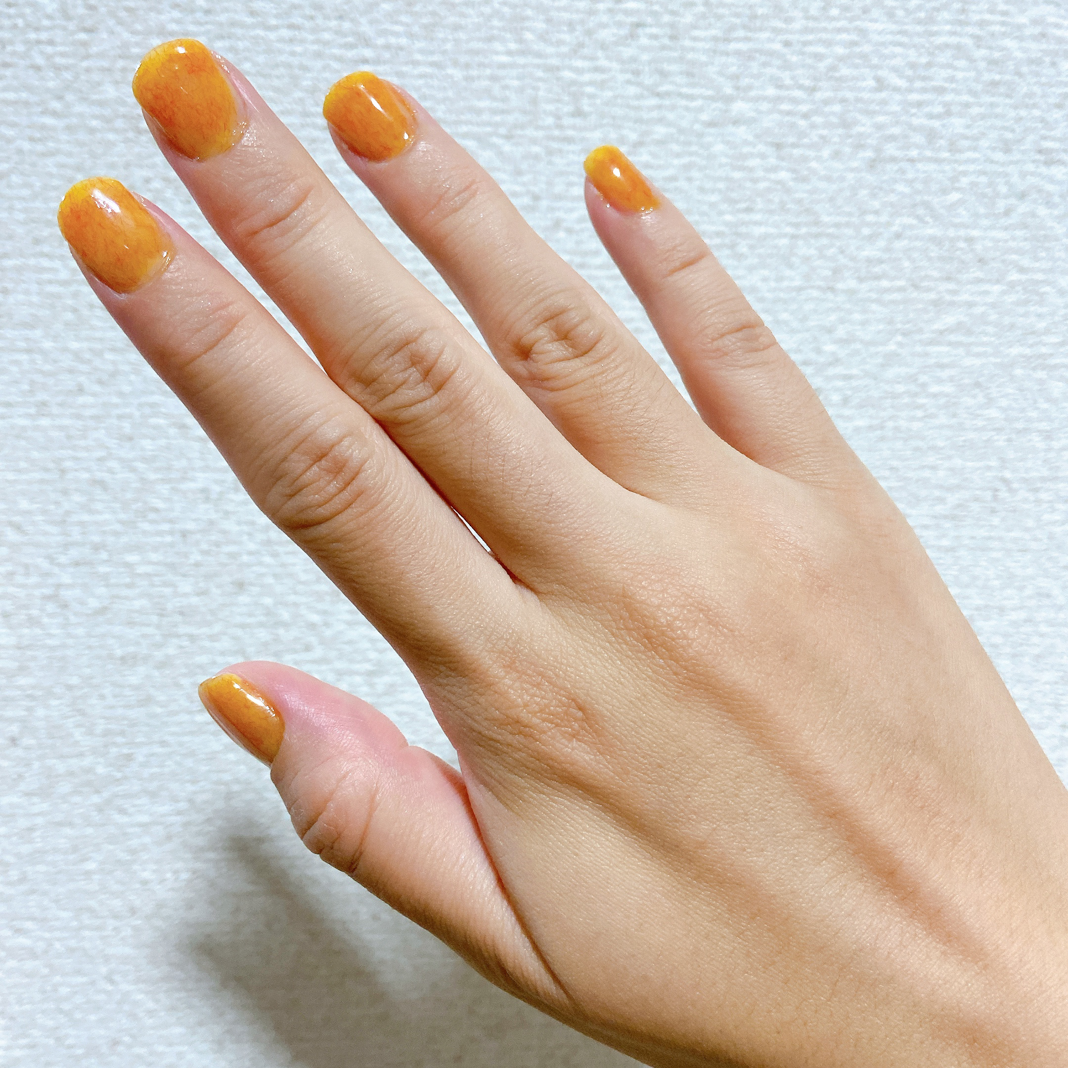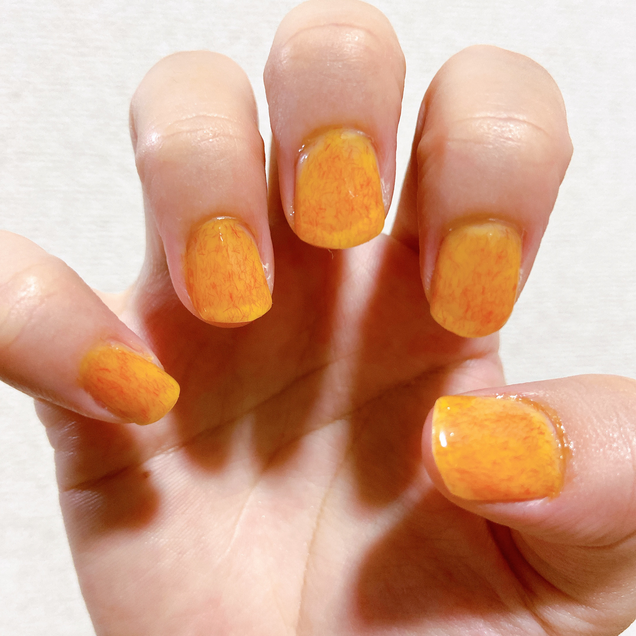 マンゴーイエローにパッションオレンジの繊維でとろ〜り甘いマンゴーラッシー🥭✨✨ 繊維入りネイルは単色でもお洒落になるので大好きです🥰 オレンジ色大好きなので沢山使おうと思います🧡