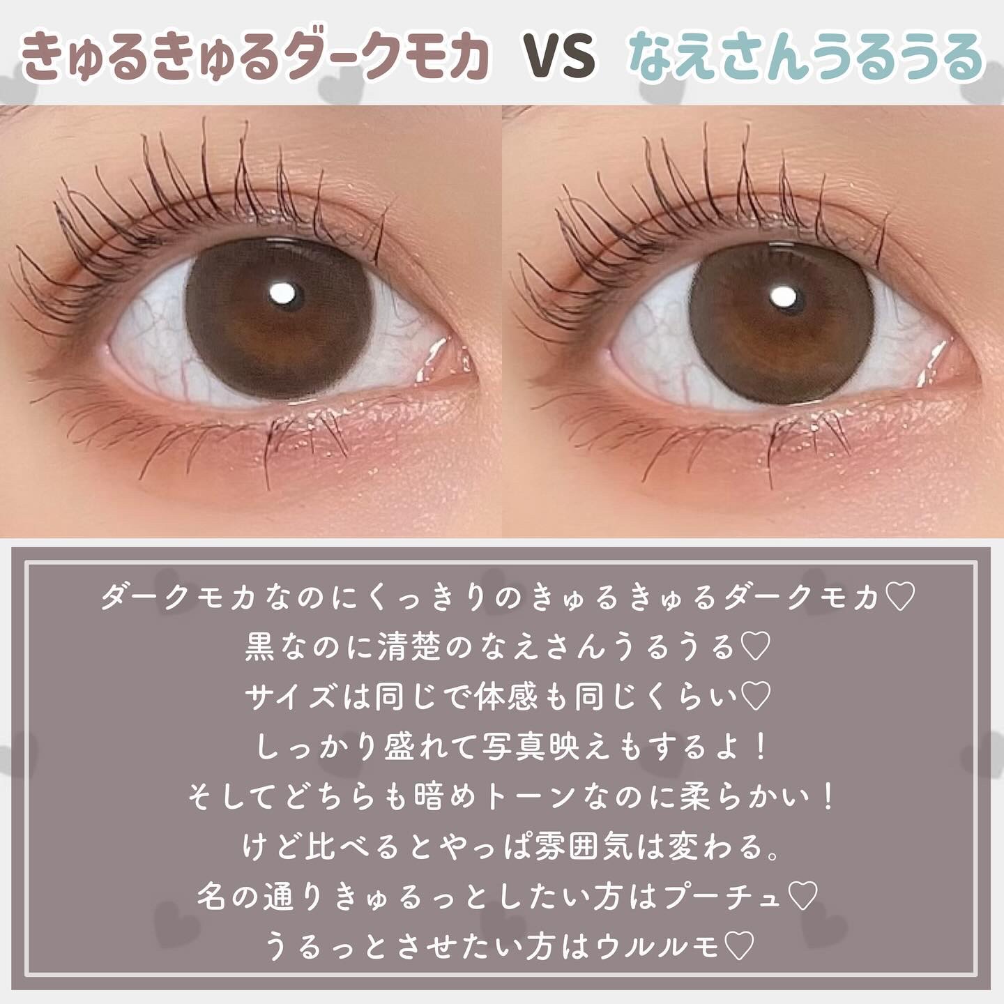 きゅるきゅる🆚うるうる似ている黒コン比べてみたよ🫣💛今回比べるのはPUUUUCHU#プーチュ#きゅるきゅるダークモカ1DayDIA14.5mm着色直径13.8mmBC8.6mm含水率38%とULULUMO#ウルルモ#なえさんうるうる1DayDIA14.5mm着色直径13.8mmBC8.6mm含水率38%┈┈┈┈┈┈┈┈┈┈┈┈比べてみて初めて知った。レンズスペック同じ👏これは確かに迷うかも😑💭きゅるきゅるダークモカは暗めトーンで地雷系🖤🎀真っ黒じゃなくてダークモカカラーだから重たさがないのにくりくりのお人形さんみたいになるのがこのカラコンのポイント💡🤍反対になえさんうるうるは透け感のある澄んだ黒でできゅるきゅるよりもうるっと清楚盛れする🩵黒に水分たっぷり含んで透明感増し増しでこちらも重たさを感じない😍!!似てても隣に並べると結構違うんだなぁと🧐✨甘めに濃くかわいく仕上げたい人にはプーチュ!すっきりした甘さが欲しい人はウルルモ!参考になったら嬉しいです😘#カラコン#黒コン#PUUUUCHU#ULULUMO#地雷系カラコン#透明感カラコン#清楚カラコン#清楚ブラック#カラコン比較#カラコン着画#カラコンレポ#カラコンレビュー#盛れカラコン#Qoo10メガ割