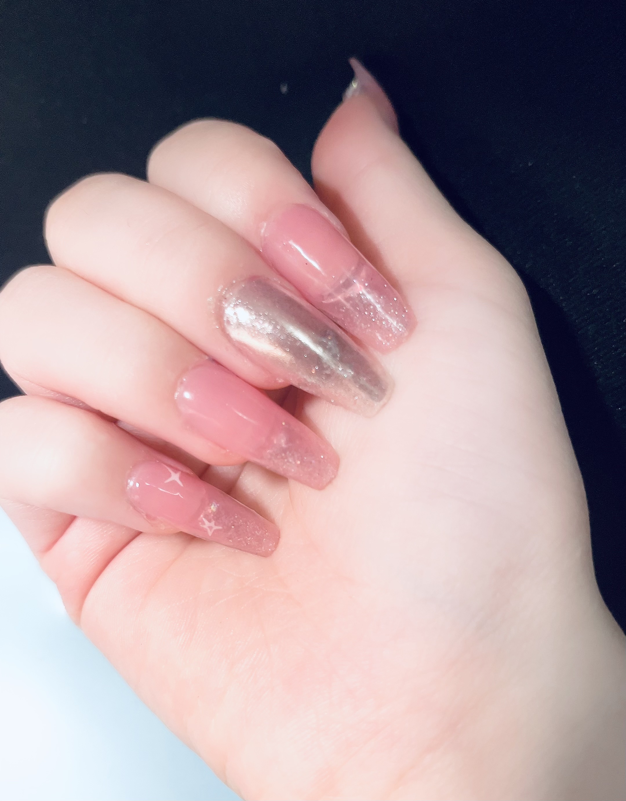 ど素人にはなかなか至難の業すぎて親指だけで断念しました。 でも、百均、楽天、SHEINでこんなに可愛くなった!沢山褒めて貰ったので共有したい! 親指▶︎ピンクのマグネットジェルネイル(磁石動かさない)に百均の白を4回ほど位置をずらして塗布し、硬化。 ベースを百均からネイル工房のものに変えたら調子いいです!!
