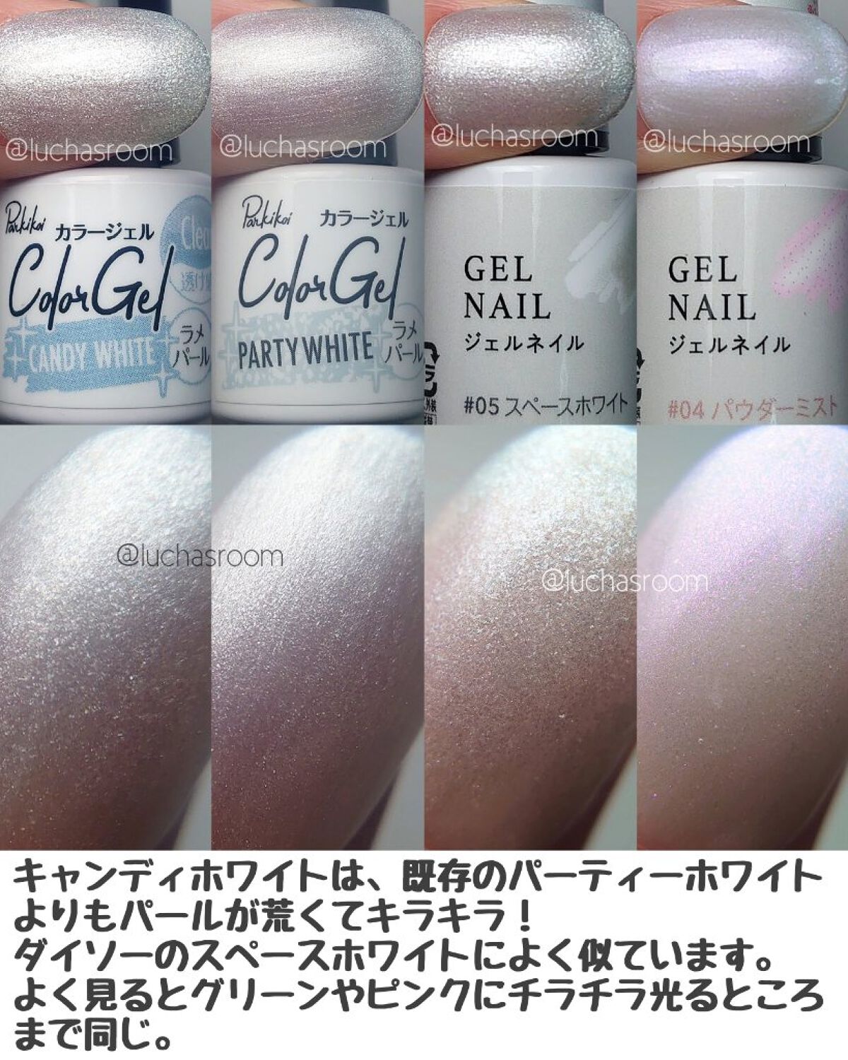 ラメがキラキラ✨ 透明感があるので、シリーズ名通りキャンディみたい♡ 手足でおそろいにしてもかわいいこと間違いなし🥰 キャンディホワイトは、塗った瞬間「ダイソーのスペースホワイトに激似!」と思いました。 ギラギラのホワイトで、よく見るとグリーンやピンクにチラチラ光るところまで同じ。 私のイチオシはキャンディレッド! 原色レッドじゃなくて、濃いピンクレッドって感じの色味がかわいい♡いちごキャンディみたいでおいしさうです🤤