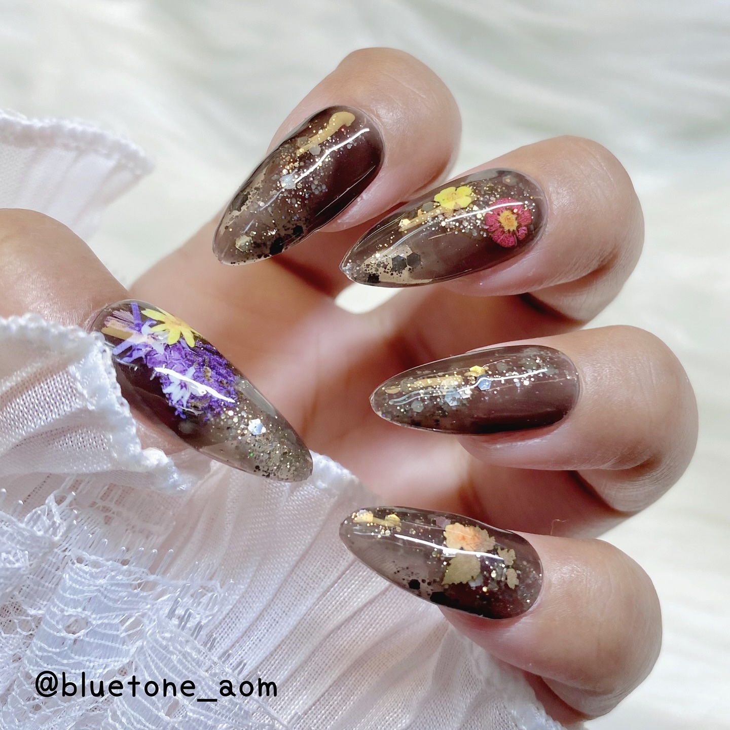 親指.薬指はシアーホワイトを全体に1度塗りシアーホワイトとマイカホワイトをそれぞれ乗せて境目を繋いでくように軽くぼかす 人差し指.中指.小指はシアーウーロンとシマーナッツをそれぞれランダムに乗せて境目を繋いでくように軽く合わせてモヤモヤにその後シアーウーロンを全体に1度重ね塗り