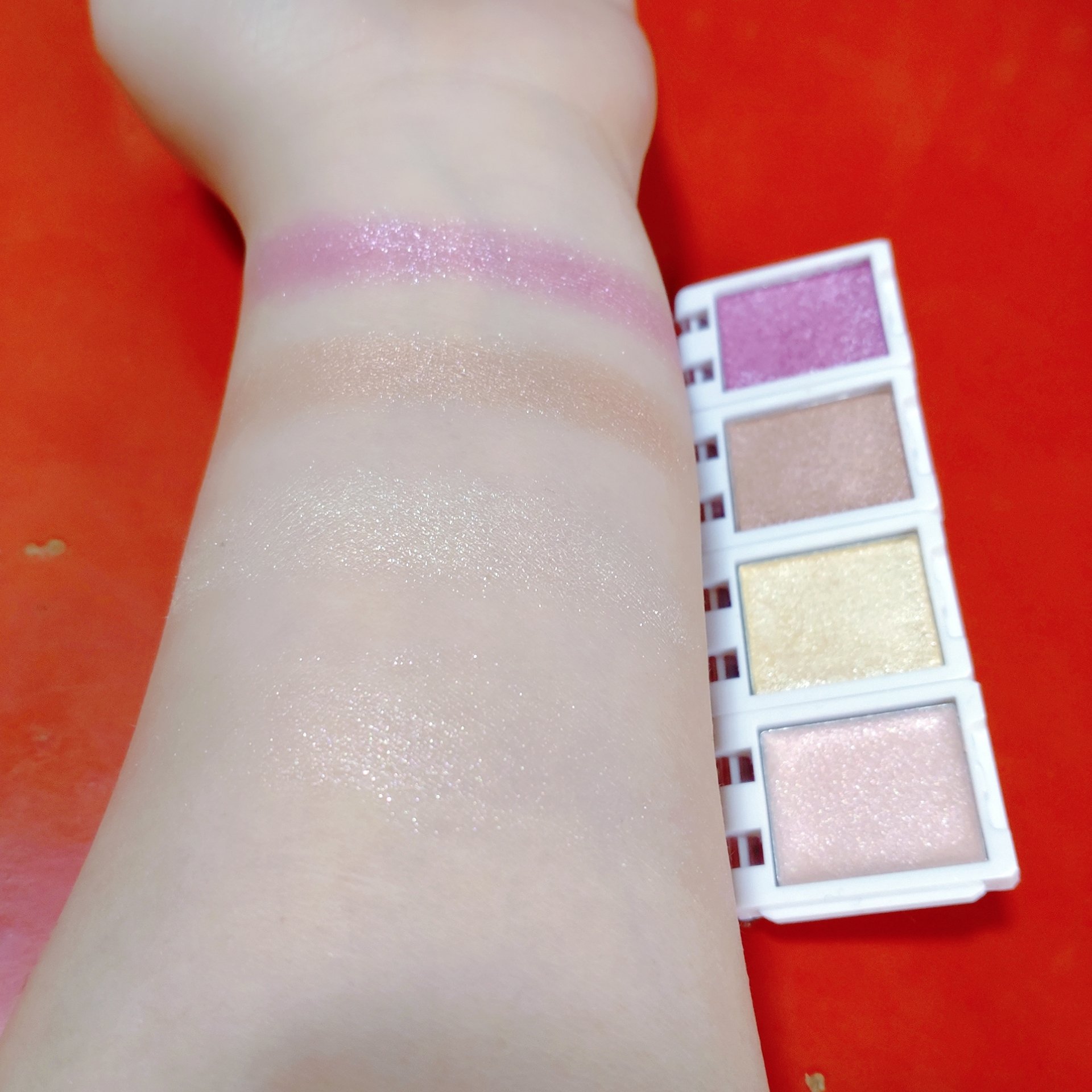 全体的な印象はラメ感多めだと感じました。 実際手に取るとラメと言うよりパール感?ツヤ感?といった印象です。 手で塗ると発色強めですが、ブラシで塗ると思いの外ナチュラル発色なので普段でも使えます! パレットの上3つはしっとりとしたパウダーですが、1番下のはクリームハイライターなのかな?と思います。 ハイライトも自然なツヤ感なので案外使いやすいです! 自分で使った感じではハズレではないな〜と思います! 気になったら試してみるのはアリだと思います😊