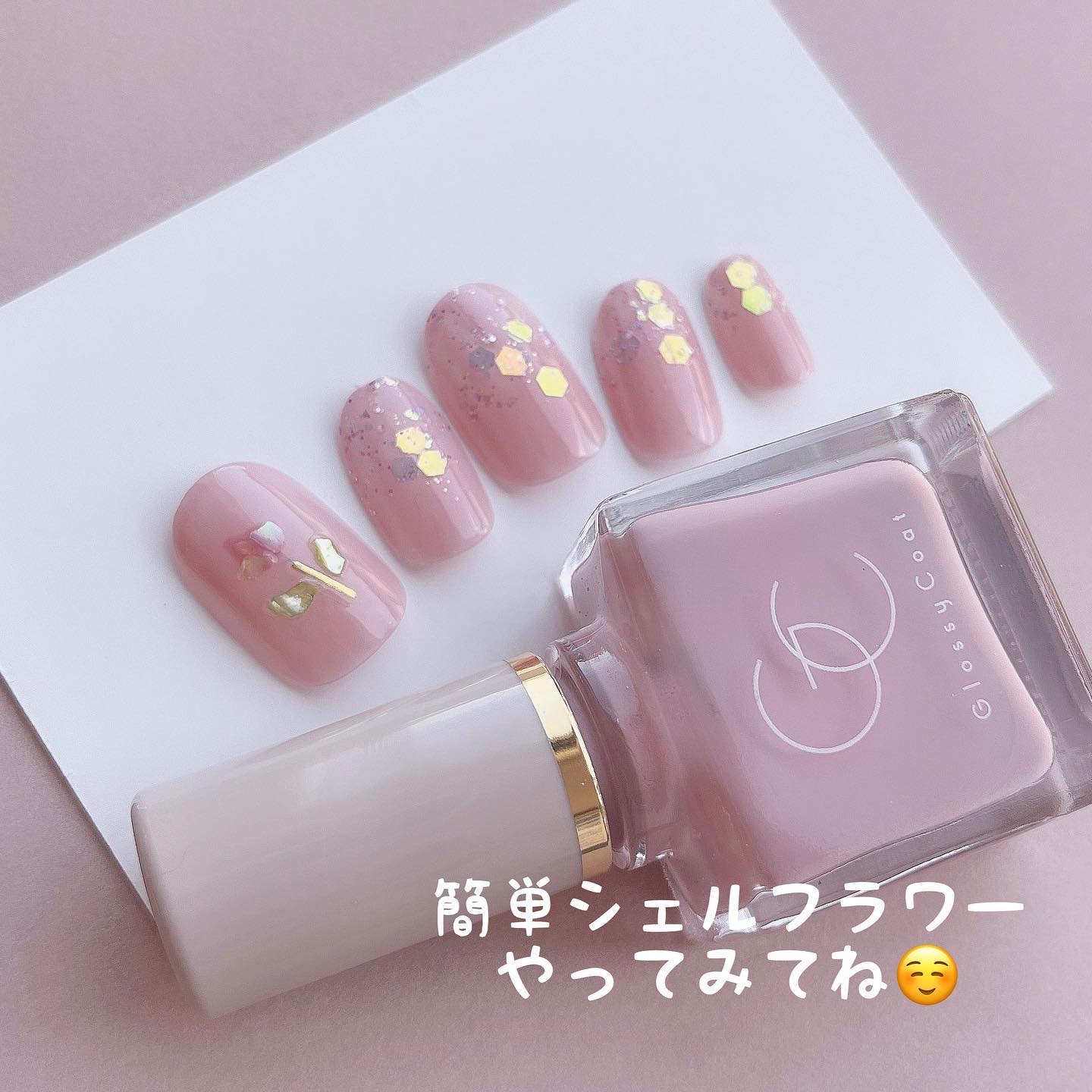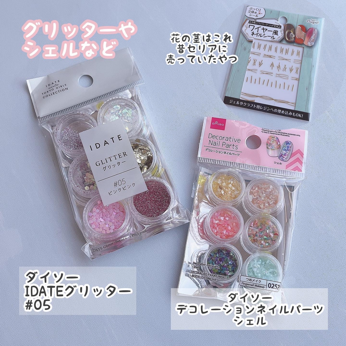 ダイソーのクラッシュシェルとグリッターを使ってシェルフラワーにしてみたよミ ˙ㅿ˙ ミ!! めっっちゃかわいい。 使用色スキューズミーグロッシーコート・モーヴピンク・ライラックピンク この2色も最高✨ 細かいクラッシュシェルは爪楊枝の先端にトップコートを少量つけて取るとつけやすいです!! 横から見たバラをイメージした..つもり。笑 お花の茎はシール以外にもヤーン(糸)やワイヤー、スティックパーツ、カーブシール、カーブスティックパーツ等でも代用可能! 是非お試しください〜🥰 グロッシーコートは@_squseme_ 提供品!