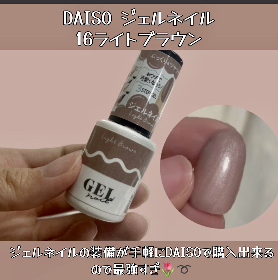 簡単!安い!私でも綺麗に塗れました💅✼••┈┈••✼••┈┈••✼••┈┈••✼••┈┈••✼DAISOBRGジェルネイル16Lightbrown✼••┈┈••✼••┈┈••✼••┈┈••✼••┈┈••✼ネイルの知識を知らない私でも簡単に塗る...