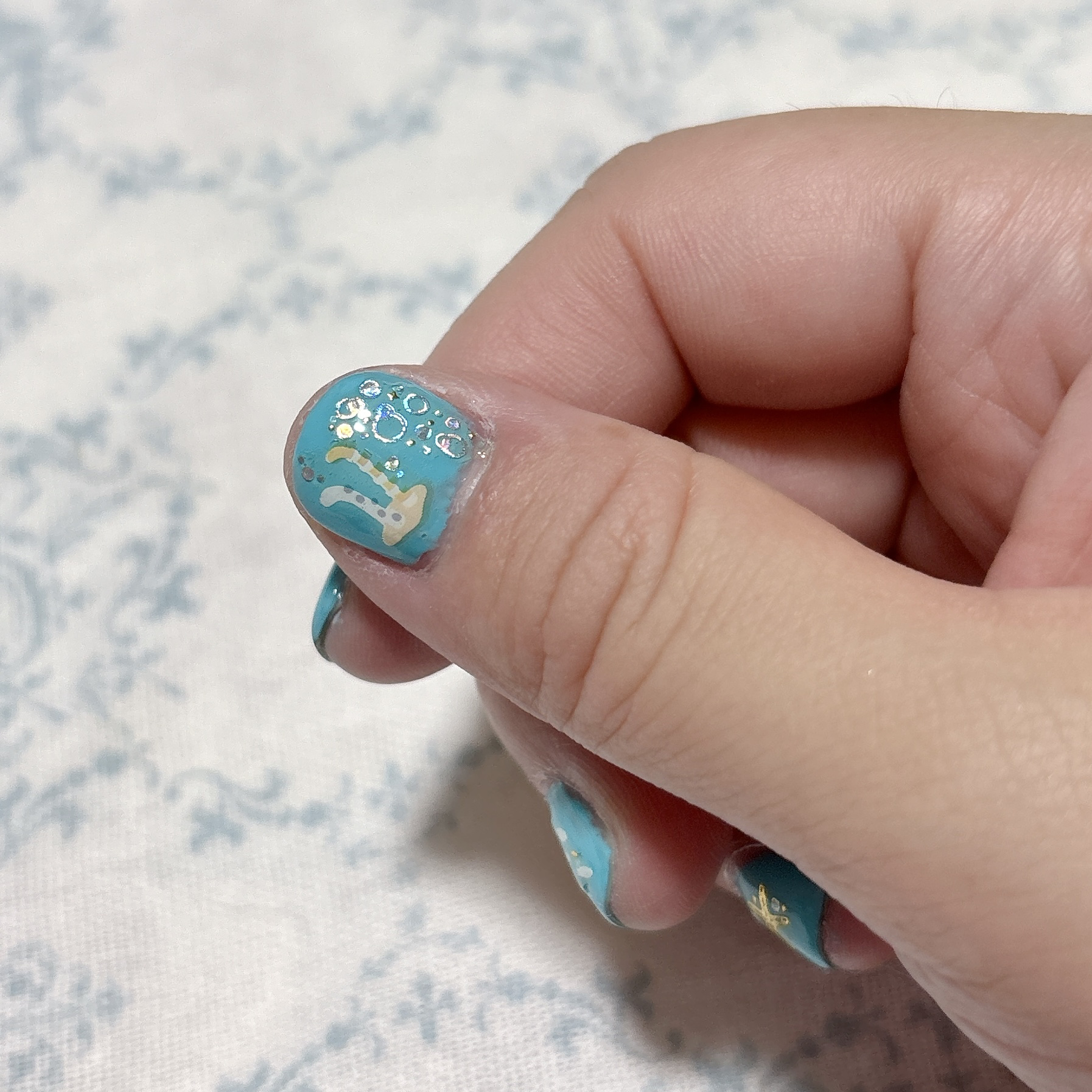 水族館に行ったので、それに合わせてセリアのネイルシールで水族館ネイルにしました🐠🫧クマノミとチンアナゴがいて可愛い!!他にもペンギンだけのデザインとかクラゲもありましたよ🪼頑張ったけど、仕事はネイルシールNGなので1日でオフしました😭😭#水族館ネイル#夏ネイル#セルフネイル#ジェルネイル#セルフジェルネイル#100均ネイル#海映えラメネイル