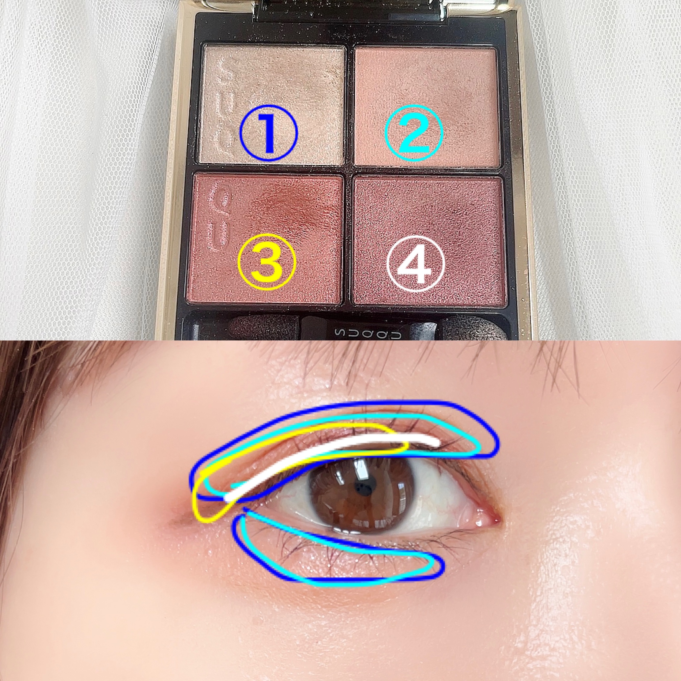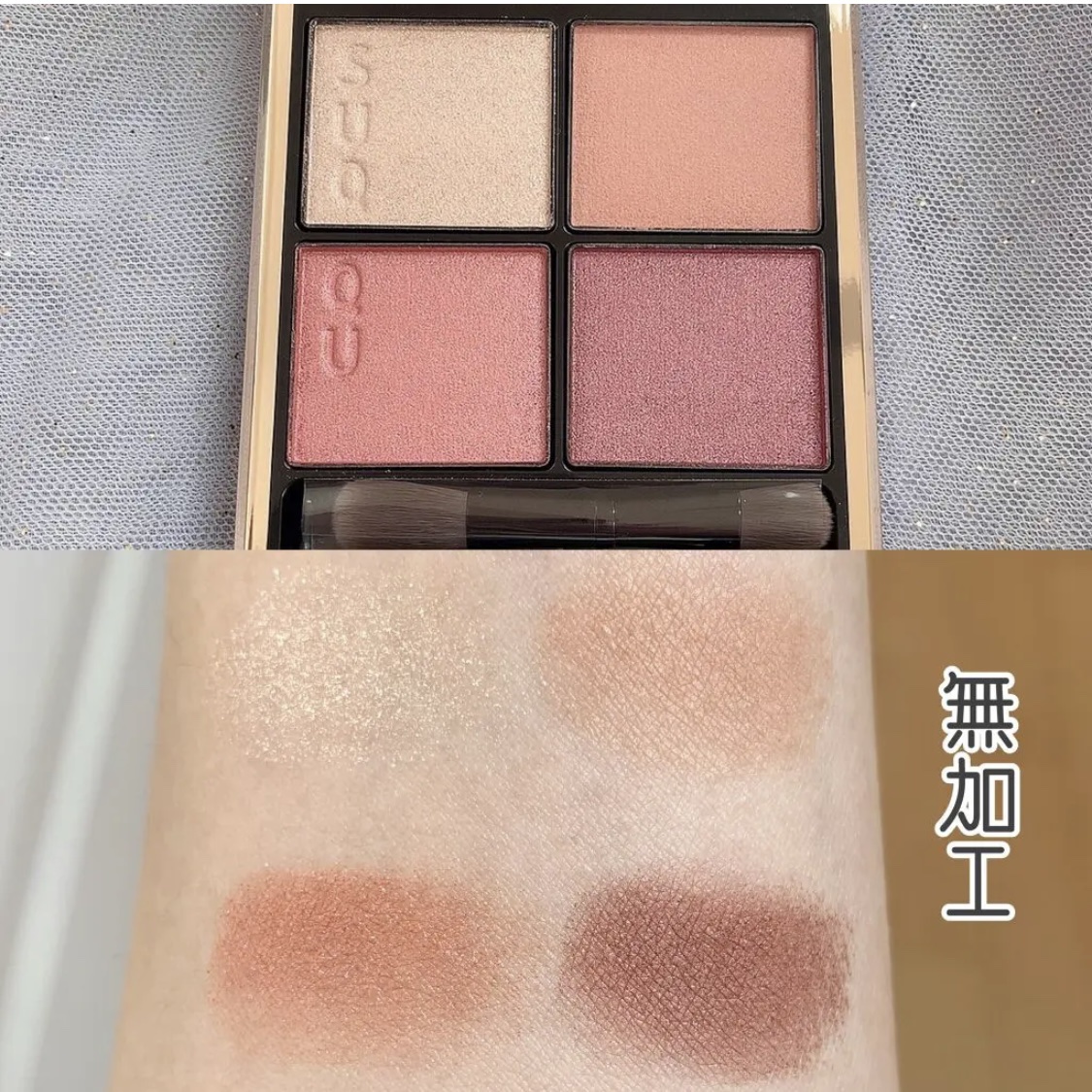 SUQQUメイク/♡••┈┈┈┈┈┈┈┈••♡#SUQQU#スックシグニチャーカラーアイズ04純撫子♡••┈┈┈┈┈┈┈┈••♡落ち着いたピンク系の色味で使いやすいパレットです!!捨て色ないし万能に使える👍✨粉質もしっとりでほんと使い心地良いアイシャドウです。アイライナーは、#ダイソー#モイティフルMFLジェルアイライナーブラウンマスカラは、#CANMAKE#キャンメイククイックラッシュカーラーセパレート04ワインモーヴを使いました。マスカラも赤みがあるものを使い統一感出しました(•̤ᴗ•̤)♡アイシャドウの塗り方は、①左上ベースカラーをアイホール、涙袋に塗ります。②右上カラーを①に重ねます。③左下ピンクを二重幅の目尻よりに塗ります。④右下カラーを細くキワに塗ります。アイライナー、マスカラをして完成👏#アイシャドウ#アイシャドウパレット#デパコス#ピンクメイク#ナチュラルメイク#こなれ感メイクテク