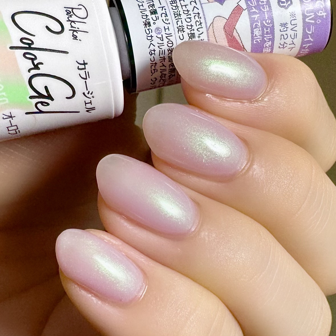 薄ピンクベースにグリーンの偏光パールが入ってるカラーです 貝の裏側みたいな感じもする 爪に塗ると乳白色のネイルぽくて 一見ナチュラルだけど光に当てると ツヤっと光る感じでそんなに派手ではない ベースはセリアのピールオフベース トップはセリアのノンワイプトップを使用しています