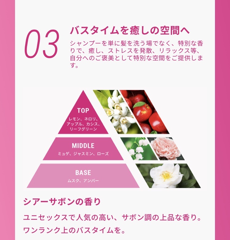 シャンプーは柔らかめの液で、 毛先までとっても伸ばしやすかった 洗い流した後すぐサラサラで仕上がりが楽しみに 香りが、 そんなに残る訳ではないけど、 甘めでちょっと苦手💦 髪質がだいぶ傷んでるけど、 ヘアオイルとかつけなくても絡まり少なかった❗