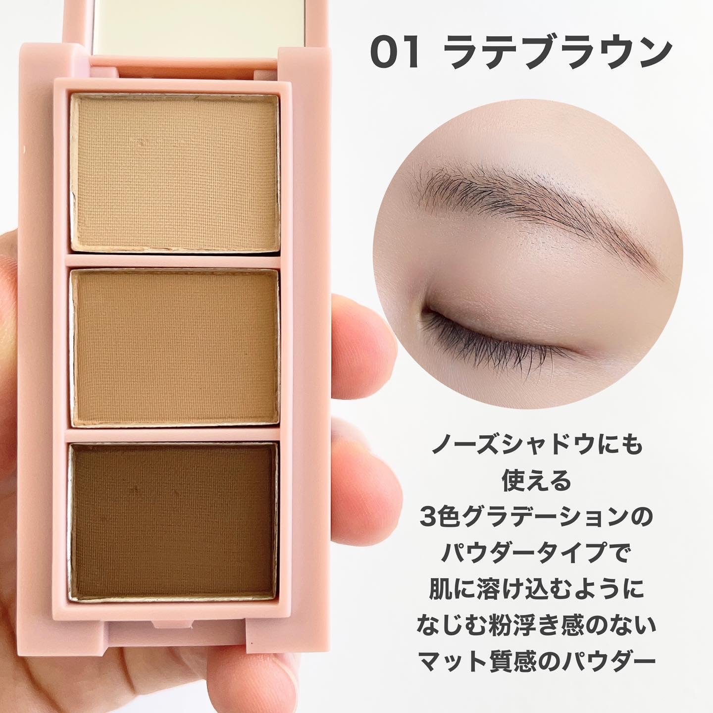 肌に溶け込むようになじむ粉浮き感のないマット質感で、ふんわり愛嬌のある立体グラデ眉に仕上がる ノーズシャドウとしても使用できて、ホリの深い印象的な目もとに仕上がる! カラーは全3色🌈 3色あるので、メイクに合わせて変えられるのが嬉しい😊 あと、理想の眉に整える付属の3種がすごい3️⃣