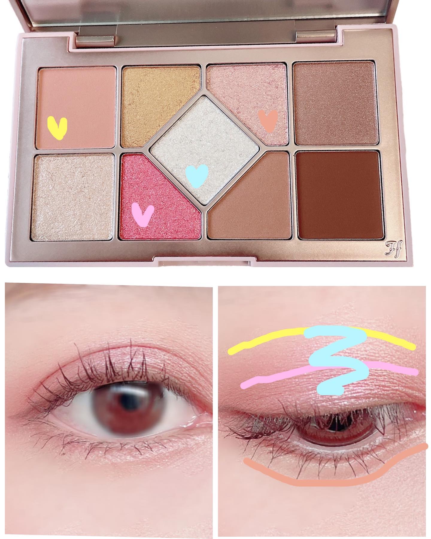 私はイエローとピンクをグラデにし真ん中にぼかすために中央の白ラメを入れました🤍 ほんとにfrunflynnのシャインユー アイシャドウパレットが使いやすすぎて大愛用😂❤️❤️