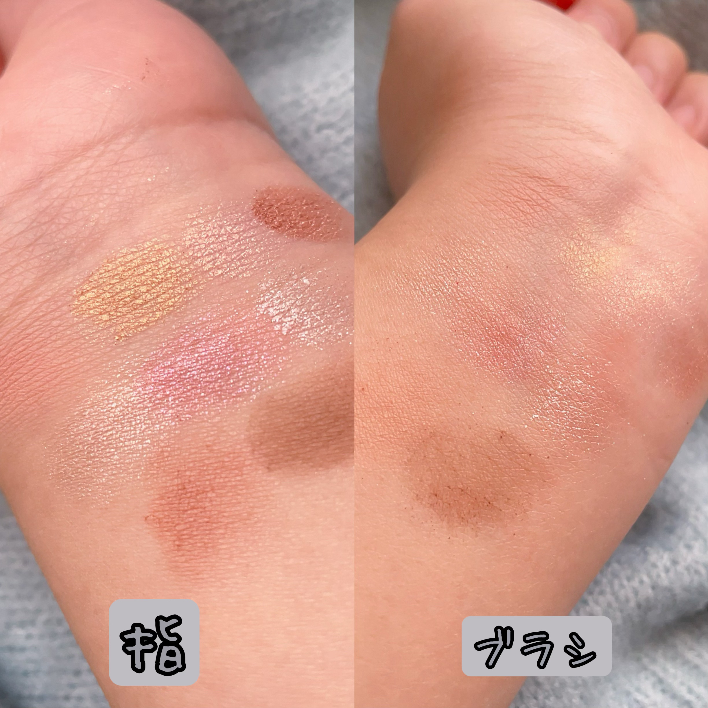 粉質がしっとりとしていて、まぶたに優しく馴染むので、粉飛びもありません。 マットカラーは濃淡をつけやすく、ブラシで境目をぼかせば綺麗なグラデーションを作ることができます。 パールやグリッターは煌めきがすごいのでメイクの仕上げに上瞼中央に乗せたり、目頭に使うと一気に華やかに…