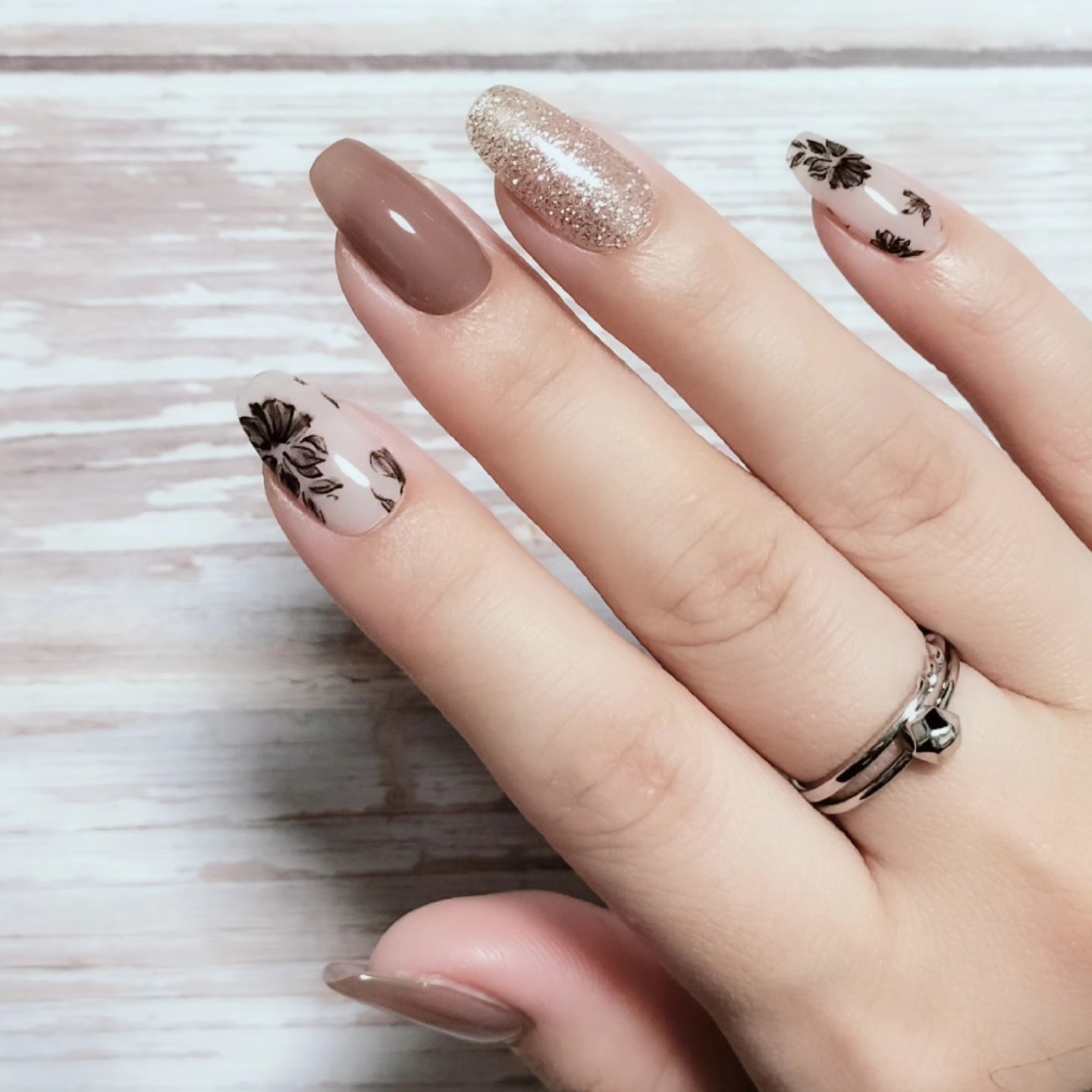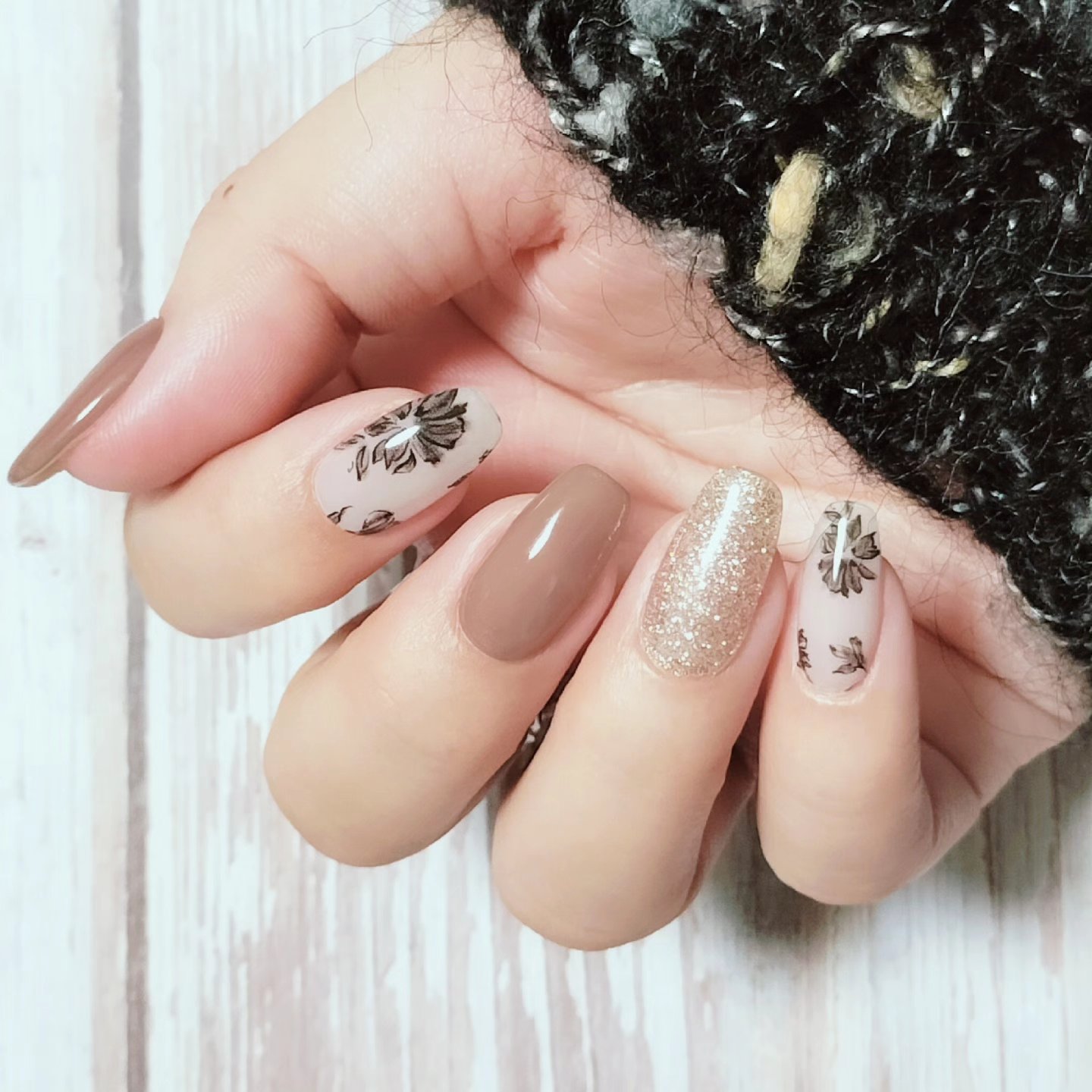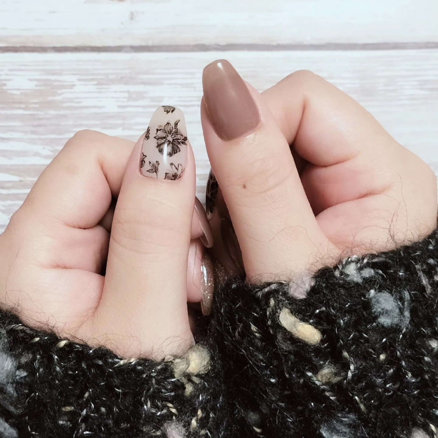 飽きて変えちゃった💅ÉDGEU INKYFLORAL(日本限定)M'AVENIR CosyBrown+α なし久しぶりの2メーカーをミックス💅このトーン落ち着く〜🫶どちらもベースコートを塗って密着度UP!そのまま貼るのと全然違う!M'AVENIRの方が若干柔らかいかな?🤔硬化してもちょっとやわらかいこのブラウン、ミルクココアみたいで可愛いな〜🥰M'AVENIRはQoo10かnuguさんで購入可能です👏#edgeu#エッジユー#EDGEUジェルネイルシール#日本限定デザイン#INKYFLORAL#mavenir#ジェルネイルシール#ネイルシール#nailwraps#nailwrap#nail#秋ネイル