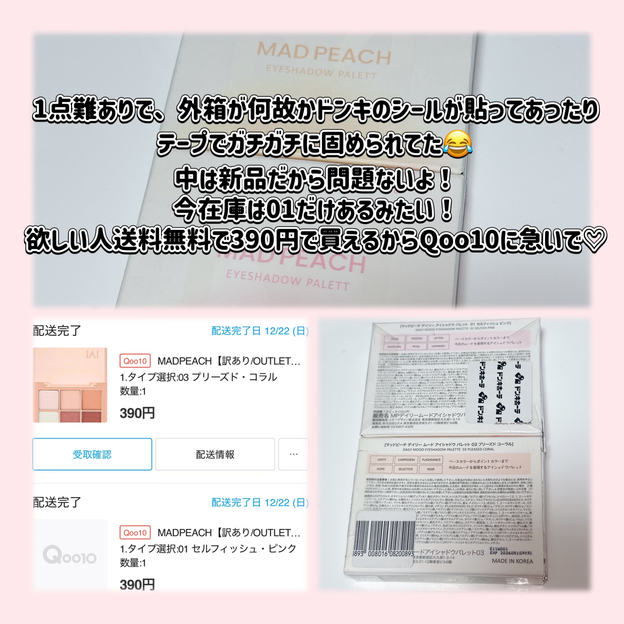 MADPEACHデイリームードアイシャドウパレット03PLEASEDCORAL✼••┈┈••✼••┈┈••✼••┈┈••✼••┈┈••✼••┈┈スパチュラを使用する下地やファンデーションが有名な「MADPEACH」この「MADPEACH」から発売されているアイシャドウパレット、激推しです🫶ベーシックなカラーからポイントシャドウまで、この1つのパレットで仕上げることが出来ます👍03番は「愛らしいベースにアプリコット果汁カラーが入ったコーラルパレット」小さめのパレットになりますが、発色とラメ感がめちゃくちゃ良い!!!捨て色がない!!!アイシャドウベースを塗ってから、このパレットを使うと、本当に綺麗に発色します!上段左端は、くすみを飛ばしてくれるカラーで、上段右端のオレンジっぽいカラーに見えますが、黄味色が強くないですし、単色だけでもすごく可愛い♡下段の真ん中と右端も、繊細なラメ感がめちゃくちゃ可愛い♡主張し過ぎないラメが推し!下段左端のポイントグリッターは、少し大きめのラメですが、ラメ飛びしません!しかも、めちゃくちゃ落ちない!!!そしてそして、涙袋までこのパレットで作れちゃいます♡惜しい点を挙げるなら…①締め色!っていう感じの締め色がないのですが、それはアイライナーで解決するかな🤔と思います。でも、このパレット内で、締め色として使おうと思えば、上段と下段の組み合わせで何とかなります(笑)②付属のチップとかがないのが残念かな🤔それがあれば外出先でも使いやすいな〜…と思います。このパレット、私、めちゃくちゃ好き♡♡♡私が使用している03番のコーラルパレットの他に01番のピンクパレット02番のブラウンパレットもあります😊Qoo10はもちろんですが、PLAZAでも販売しているのを見かけたので、色味が気になる方は、店頭でチェックしてみるのも良いと思います🙆♀️#madpeach#MADPEACH#デイリームードアイシャドウパレット#03#コーラルパレット#アイシャドウパレット#ラメが可愛い#ラメ飛びしない#主張し過ぎないラメ#正直レビュー#新入りコスメ本音レポ