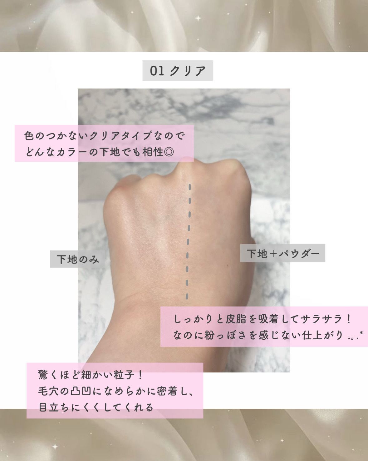 片栗粉のようなサラサラ感で、肌にのせてもサラサラ!で、びっくりしました👀 カバー力はないので、下地やファンデは必要かと思いますが、サラサラに仕上がります(*^^*) 私はツヤ感も欲しいので、ハイライトを上からのせています♡♡