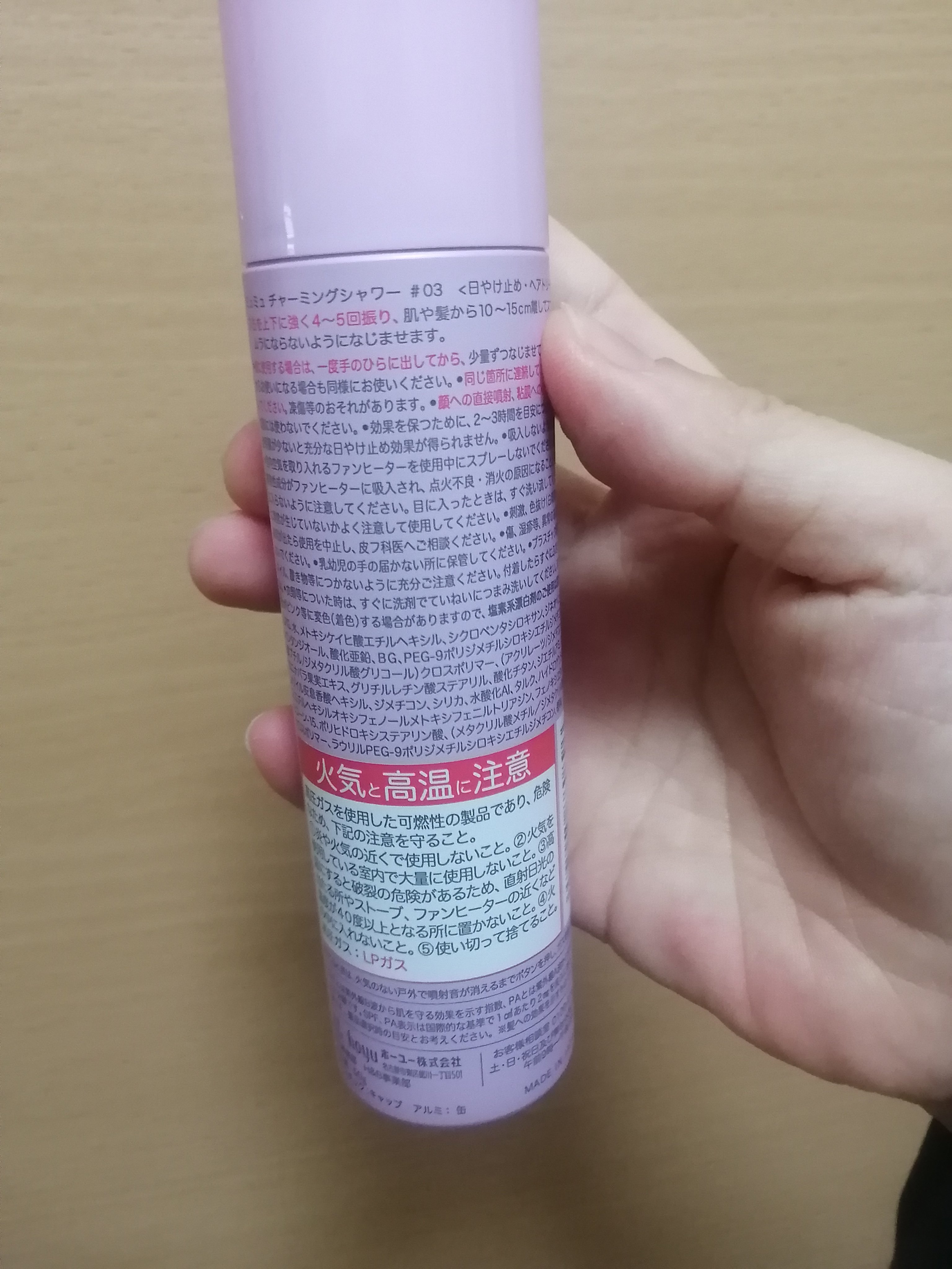 ミュミュチャーミングシャワー日焼け止め、ヘアフレグランス、髪のダメージケアをしてくれるスプレー。SPF50+PA++++香りは6種類あって、私が行ったお店では#01と#05が売り切れていました。残りの4種類の香りを試して私は#03に。ピンクで...