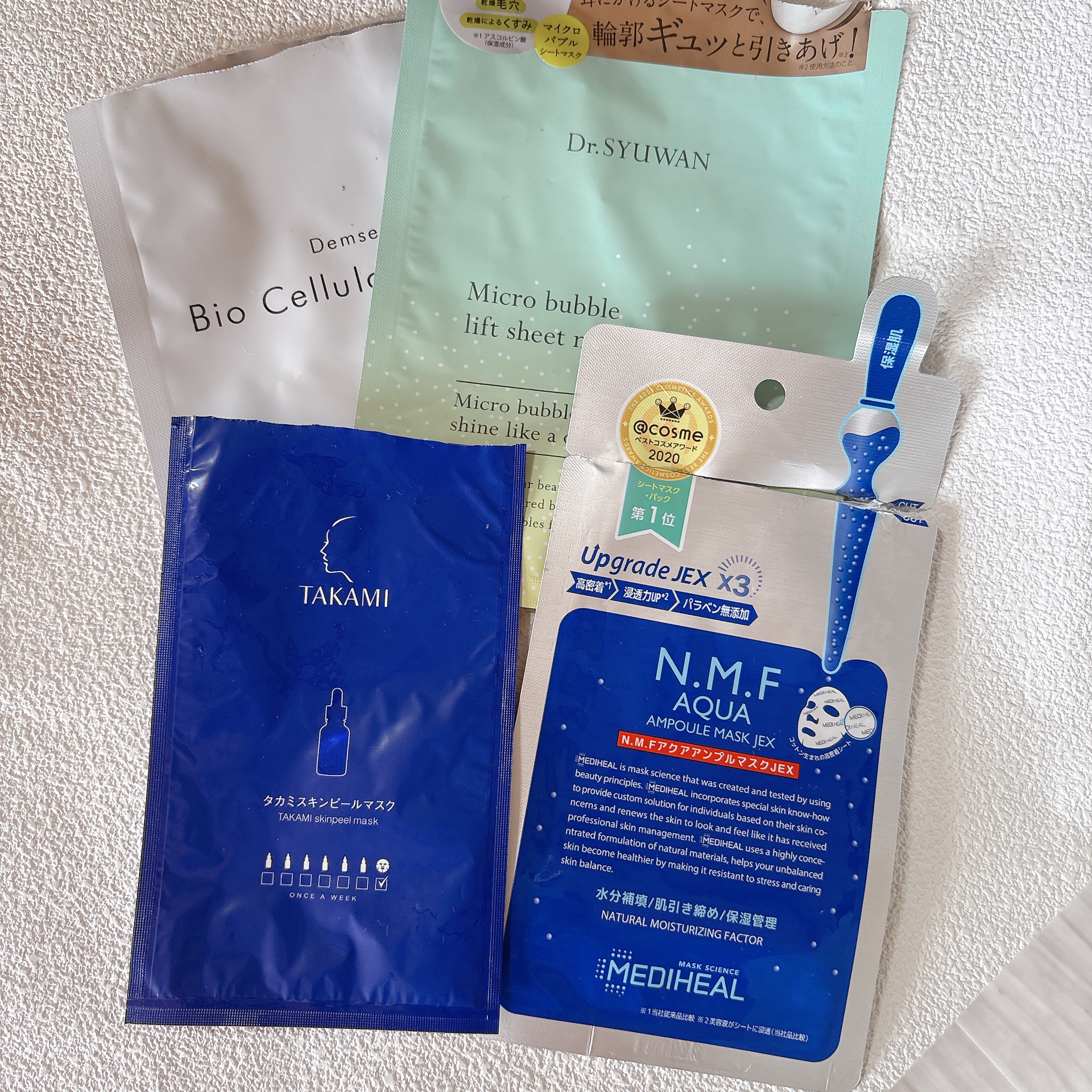 DSWマイクロバブルリフトシートマスク1枚 ¥770香りが甘いラムネみたいで好みではない。リフトアップという意味ではいいのかもしれないけど、耳にかけるのけっこうキツめでした。めちゃ炭酸で面白かったけど、パックだけ韓国製なのが残念…⋱⋰⋱⋰⋱⋰⋱⋰⋱⋰⋱⋰⋱⋰⋱⋰MEDIHEALN.M.FアクアアンプルマスクJEX¥1,069シートが柔らかくて薄くて密着してくれて良い。大きいところも好き。⋱⋰⋱⋰⋱⋰⋱⋰⋱⋰⋱⋰⋱⋰⋱⋰タカミタカミスキンピールマスク¥4,180美容液ポタポタ落ちるけど、3分だからまぁ良し。肌もっちりで感度する!!肌も白くなる。