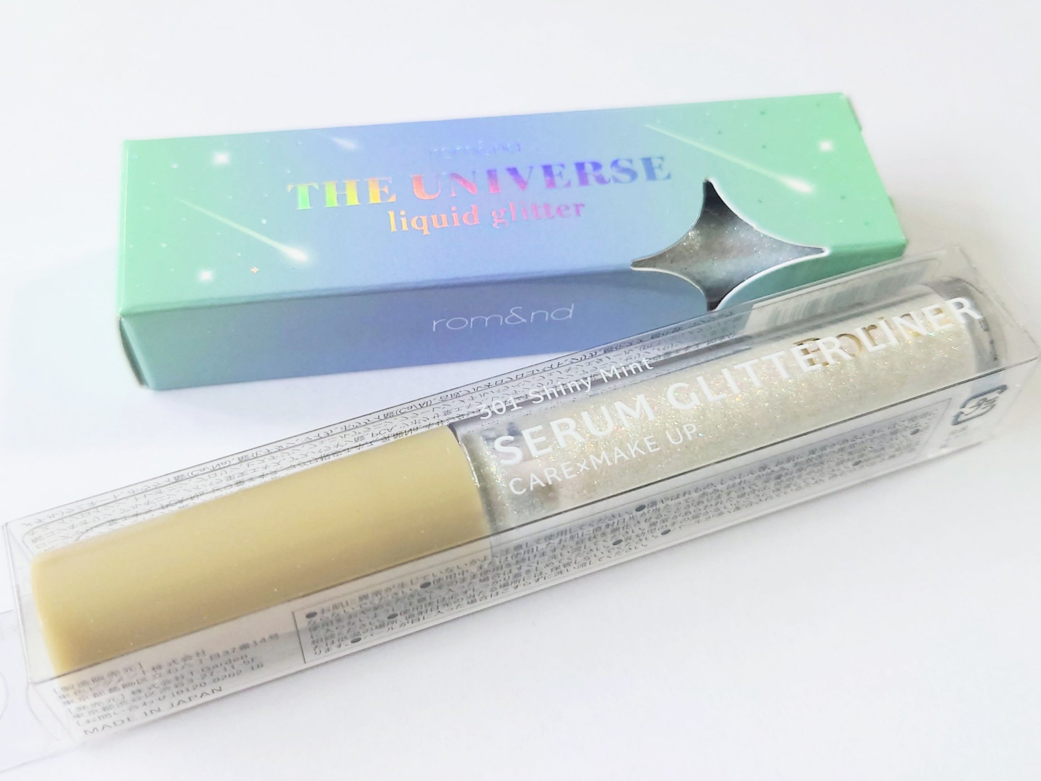・リピートしたいというかしてます。(保存用)・Boricaの美容液ラメライナーシャイニーミントはかなりホワイト寄りでだいぶシャイニーしてます。・ベースホワイトにミントカラーのラメが入ってるイメージ。・逆にrom&ndリキッドグリッターシャドウMINTYWAYはミントラメ感強め。・どっちもかわいい。#キラキラ夏コスメ