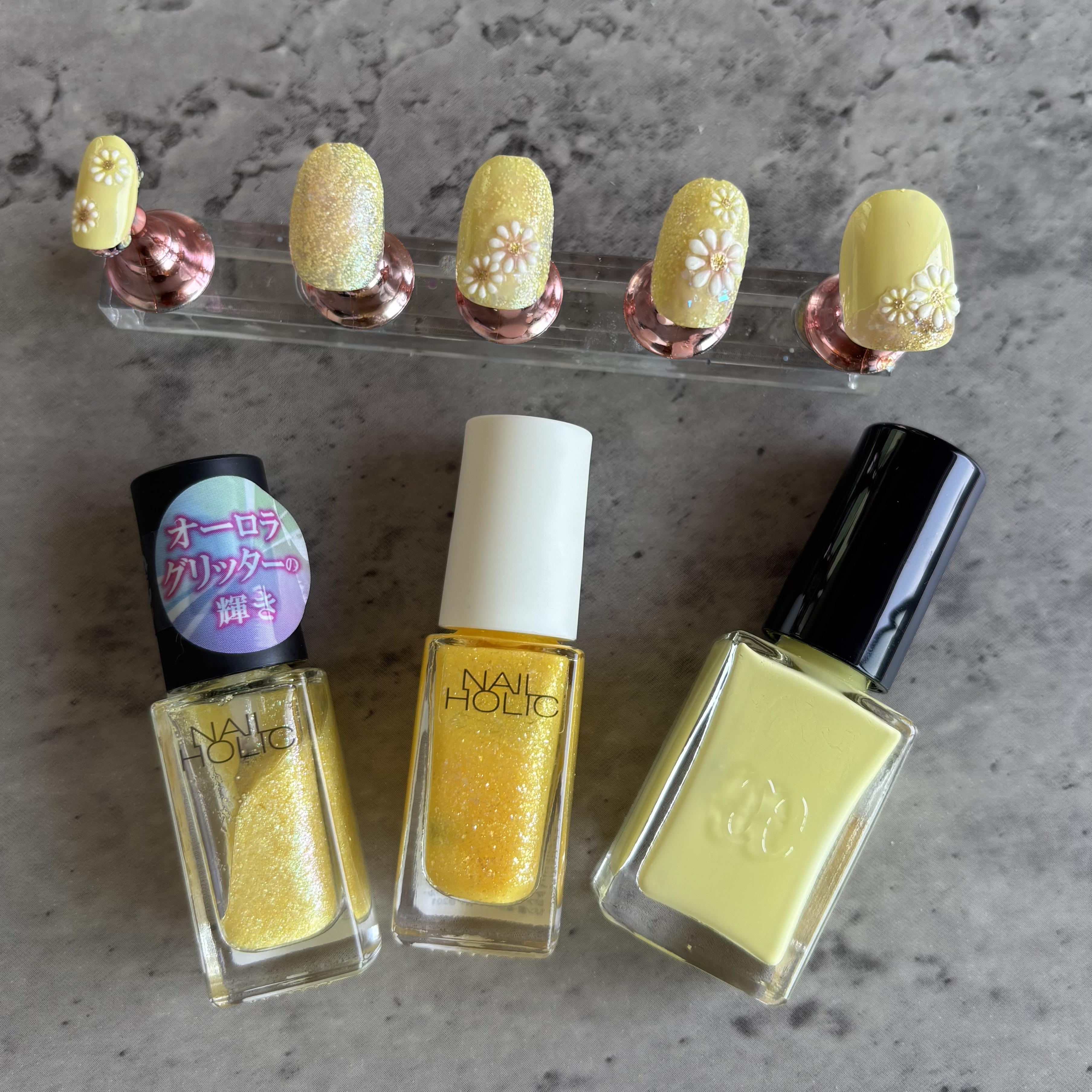 きイエロー💛きいレモン🍋💛のネイル💅💛 1⃣Diorディオール ヴェルニ 007ジャスミンサマー コレクション 2023数量限定色 2⃣ネイルホリック リミテッドカラー カスタムジェラート YE513マンゴー 3️⃣DAISO Somptueux ソンプチューネイルポリッシュST-NP-01