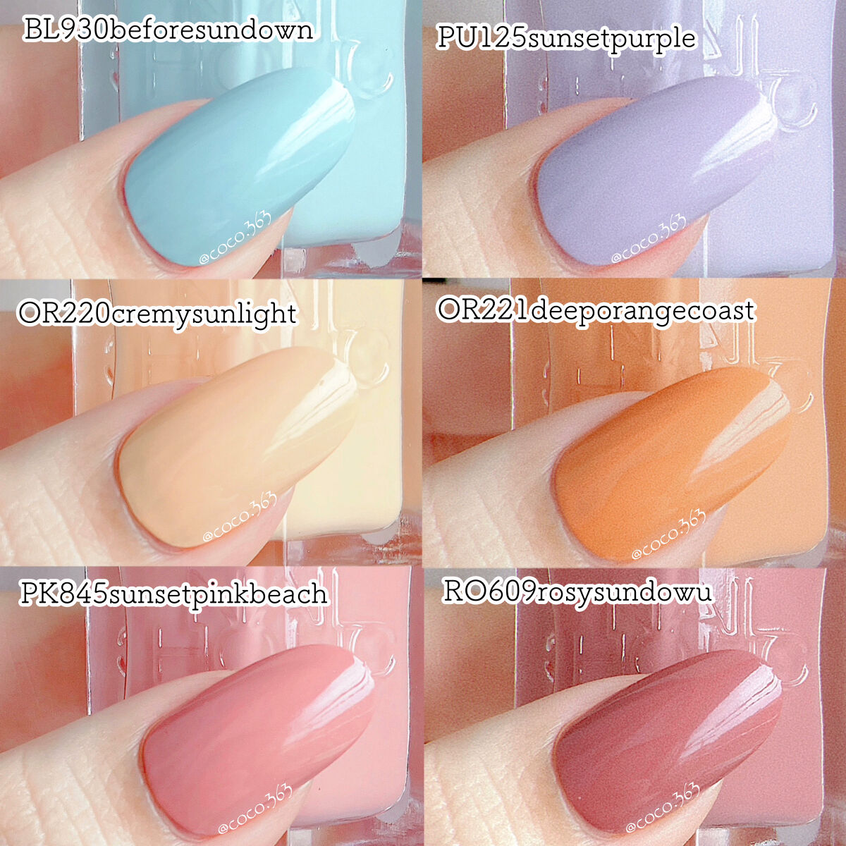 テーマは"In the Twilight"で、夕暮れ時の心落ち着く時間をイメージした、やさしいくすみカラー♡ カラーは以下の6色。 BL930 before sundown PU125 sunset purple OR220 creamy sunlight OR221 deep orange coast PK845 sunset pink beach RO609 rosy sundown クリーミーな色合いで、本当にやさしい色合いです。 ボトルが大きい分どっしりと安定感があるのと、長い持ち手&ラウンド平筆で塗りやすさはピカイチ✨ 通常色はベージュ、ピンク、レッド、ボルドー系統のカラーしかないため、限定色は要チェックです👀