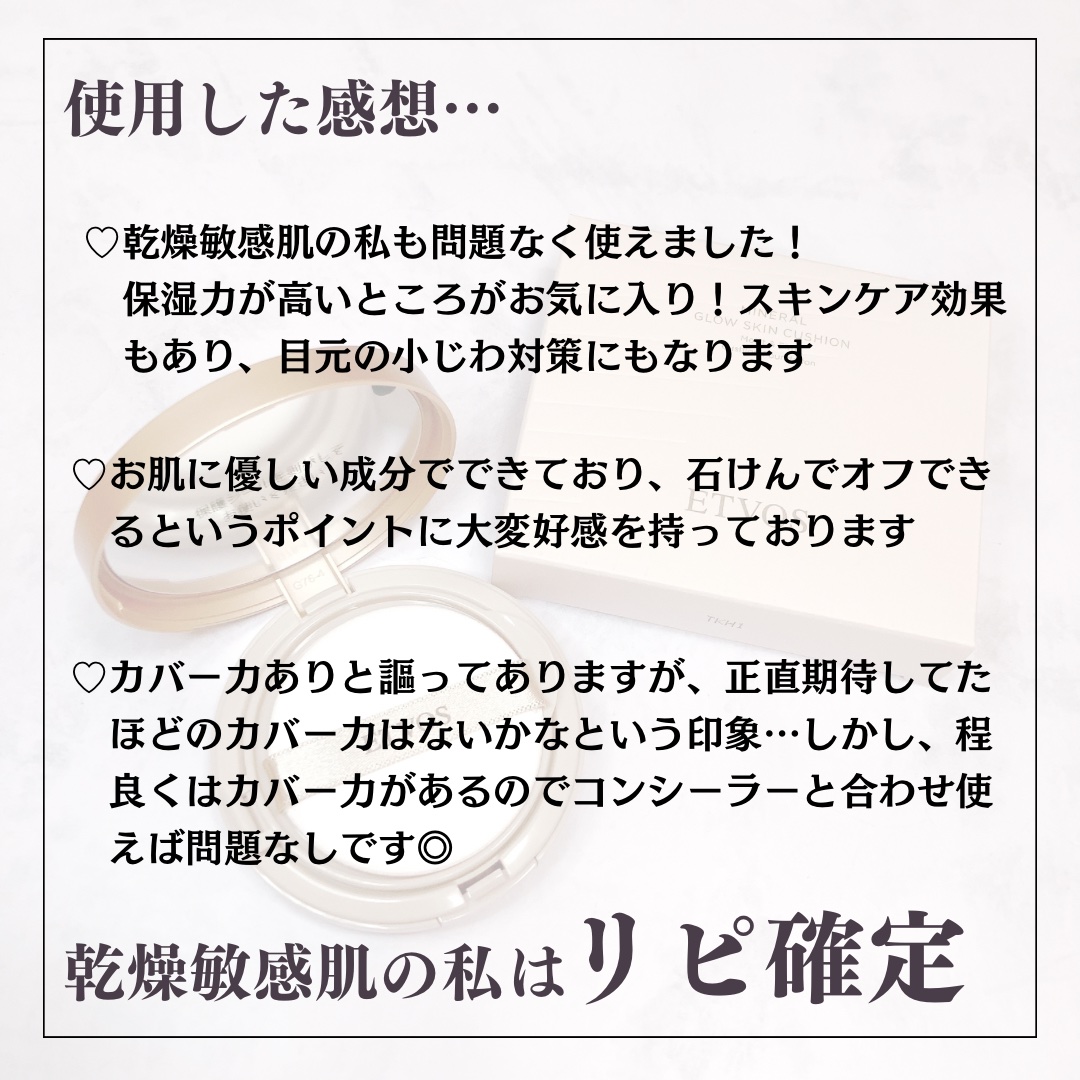 リピ確ファンデに出会えました!乾燥敏感肌の私も安心して使えました❤️🔥*┈┈┈┈┈┈┈┈┈┈┈┈*■ETVOS【ネラルグロウスキンクッション(ケース+パフ付)】■カラーバリエーション(全4色)■¥5,940(税込)*┈┈┈┈┈┈┈┈┈┈┈┈*【おすすめポイント】♡SPF32PA+++♡高いスキンケア効果♡乾燥による小じわを目立たなくする♡美容液のような使い心地♡石けんオフできるお肌に優しいファンデ♡8つの不使用 石油系界面活性剤・鉱物油 シリコン・香料・タール系色素 防腐剤•アルコール・紫外線吸収剤【使用した感想・・・】♡乾燥敏感肌の私も問題なく使えました! 保湿力が高いところがお気に入り!スキンケア効果もあり、目元の小じわ対策にもなります♡お肌に優しい成分でできており、石けんでオフできるというポイントに大変好感を持っております♡カバーカありと謳ってありますが、正直期待してたほどのカバーカはないかなという印象・・・しかし、程良くはカバー力があるのでコンシーラーと合わせ使えば問題なしです◎!!乾燥敏感肌の私はリピ確定!!#etovos#クッションファンデ#乾燥肌_敏感肌_ファンデーション#乾燥肌_敏感肌