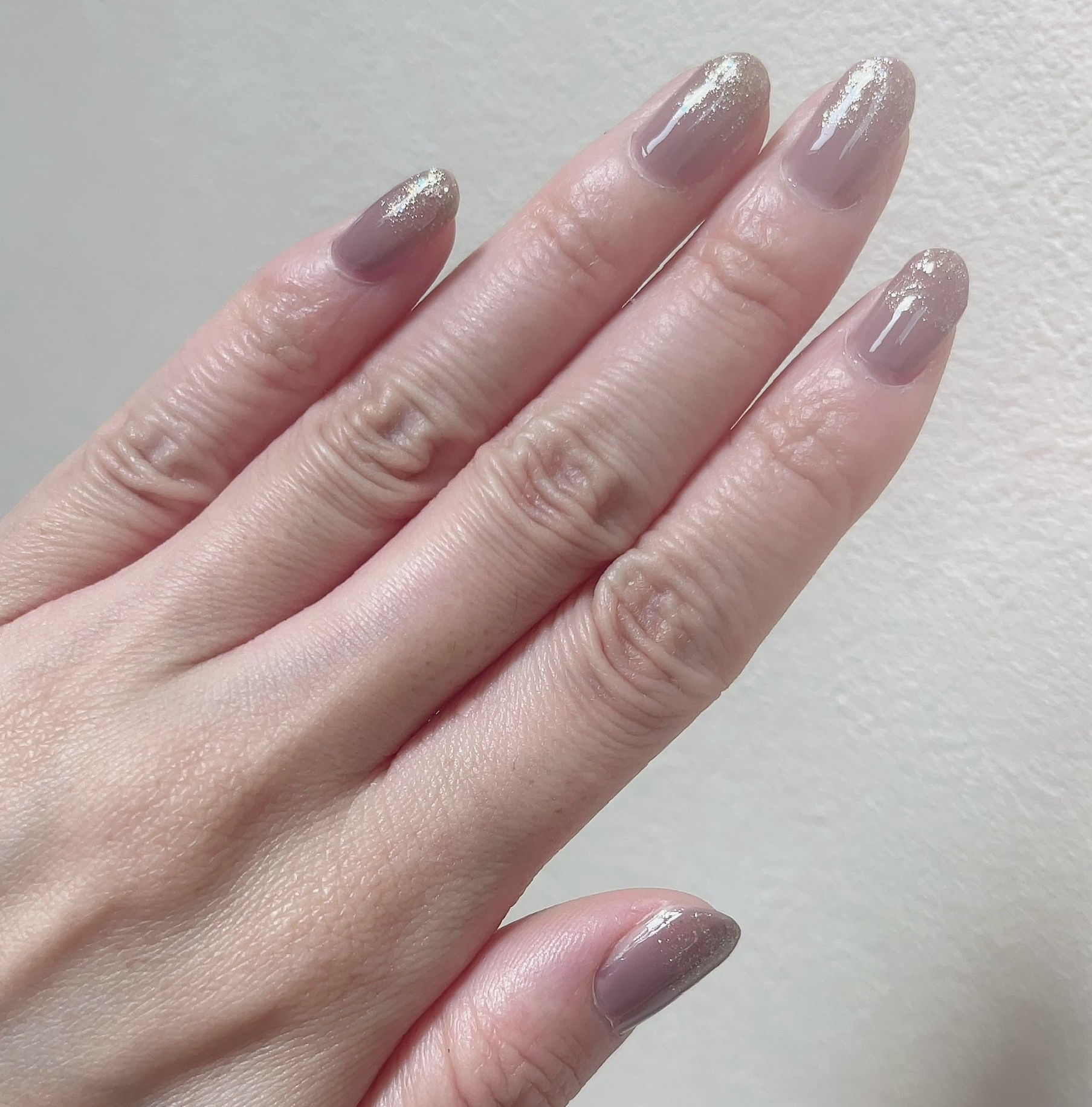 キャンドゥ リキュールネイル 鷲色でグラデーションして、キャンメイクのN83ムーンレイで色の境目にラメを置きました深みのあるブラウンがとても綺麗なカラーです