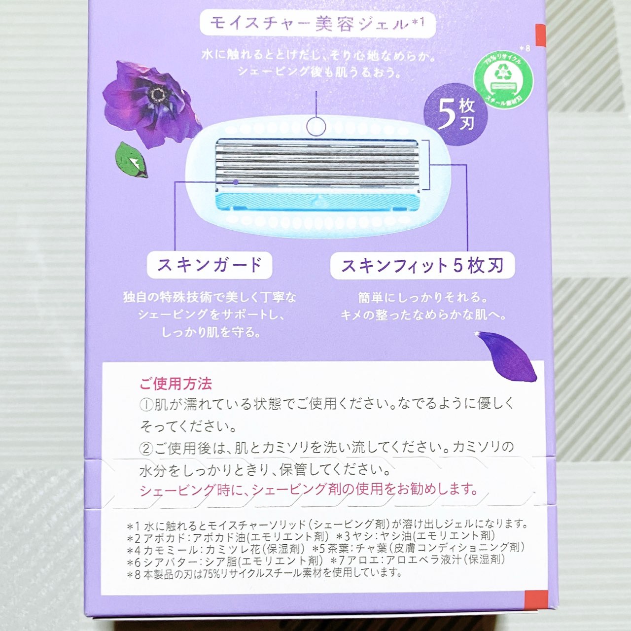 「モイスチャー美容ジェル」にヒアルロン酸&セラミド*1を配合。水にふれると溶け出し、そった後も、肌うるおう! 身体のカーブにそって、簡単にしっかりと剃ることができるスキンフィット5枚刃 刃の1枚1枚についた独自のスキンガードが肌への負担を軽減 もちろん、5枚刃ということもあり、1度で仕上がるのも良いところ🫶🏻 小回りがきくヘッドなので、肘や膝など使いにくい部分も簡単にケア出来ちゃいます🙆🏻♀️ 少しでも肌負担を軽減させたい〜っという方は、要チェックです👀💕